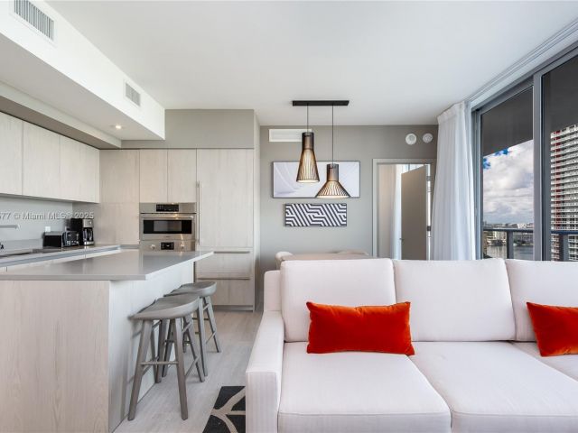 and private bathroom. The second bedroom has a queen-sized bed; the third bedroom has two full beds. Floor-toceiling glass windows in the living room can accommodate two passengers on a queen-sized sofa bed. Fully