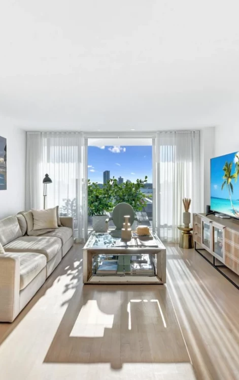 Beautifully furnished, 2-bed 2-bath unit with a split floor plan and a large terrace overlooking Sunset Harbour. Experience Miami Beach in the hottest urban neighborhood with local walkable vibes, great restaurants, coffee shops, boutiques, gyms, and a new waterfront park with incredible sunset and Miami’s skyline views! Unit features wood floors, living room/dining area, open kitchen with breakfast bar, primary bedroom with en-suite bath, 2 walk-in closets and 1 storage closet, and second bed/office with a walk-in closet and full bath. 1 assigned parking on 3 floor. Sunset Harbour South is a bayfront condo with west-facing amenities: gym, conference room, and sauna are open, pool under renovation.
