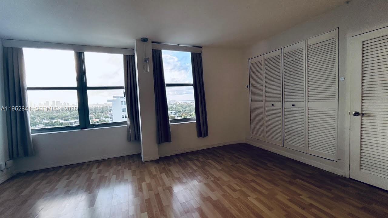 A sunny, spotless, and open floor plan large studio with magical views of the sunset, Miami Beach and Downtown Miami. A Murphy bed , massive walk-in closet and open kitchen with everything you need — a gorgeous and large marble island that you can cook , entertain or look out on the city . Dishwasher, large sink, microwave, fridge, and plenty of cabinet space. The bathroom is spacious with a closet for your toiletries and towels. The huge walk in closet allows for privacy, plenty of storage . Murphy bed with mattress.