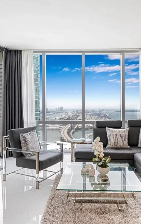 Welcome to the absolute most stunning direct water view 2bed/3bath + den condo with enclosed direct and completely furnished on one of the highest floors at Paramount Miami. Features include: private elevator, direct water view, huge terrace, floor to ceiling windows, 10 ft high ceilings, white tile floors, marble backsplash, gourmet kitchen w/Bosch and Sub Zero appliances, split floor plan, huge master bathroom w/sunken tub & shower, large walk in closet, enclosed den, washer/dryer area, spacious second bedroom with private bathroom. Nicely furnished with l leather sofa, tons of patio furniture, king bed, TV, dining table and more. Have access to world class amenities: basketball, tennis, 5 pools, boxing, spa, gym, shopping and more.