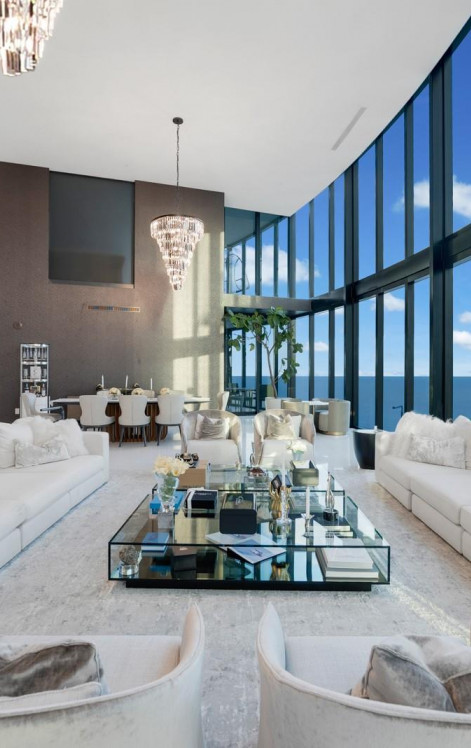 Porsche Penthouse 5201 is a true mansion in the sky offering oceanfront luxury, elegance, and sophistication. This extraordinary two-story residence features 4 bedrooms and 5.5 bathrooms across over 6,100 SF, with an open layout and dramatic 21-foot floor-to-ceiling windows showcasing breathtaking ocean views. Interiors include white marble floors, designer finishes, and two grand chandeliers. Car enthusiasts will love the elevated private 4-car garage with direct access via the iconic Dezervator car elevator. Two expansive terraces offer a private jacuzzi on the balcony, summer kitchen, and lounge areas. Residents enjoy exclusive access to a private beach, pool, spa, private restaurant with room service, pool service, beach service, car simulator, sports simulator, movie theatre, private party room, beauty salon, Vichy shower, cold plunge, concierge, car concierge and curated social events.