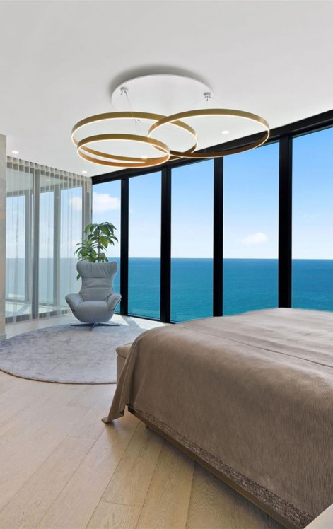 Enjoy a modern, open-concept design with a Poggenpohl kitchen featuring motorized cabinetry and an expansive island. Floor-to-ceiling glass highlights breathtaking ocean views, while premium marble countertops elevate both the kitchen and bathrooms.