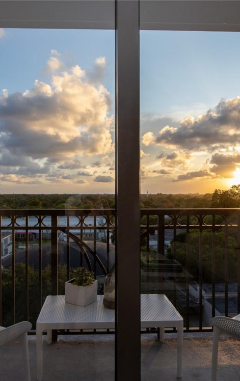Relax and unwind on two private balconies offering breathtaking views of the city skyline and vibrant sunsets. The interior features premium finishes, including sleek ceramic flooring throughout, custom walk-in closets, and a gourmet Italian kitchen equipped with Bosch appliances and elegant white quartz countertops. Modern conveniences include a smart Nest thermostat and high-end Grohe fixtures.