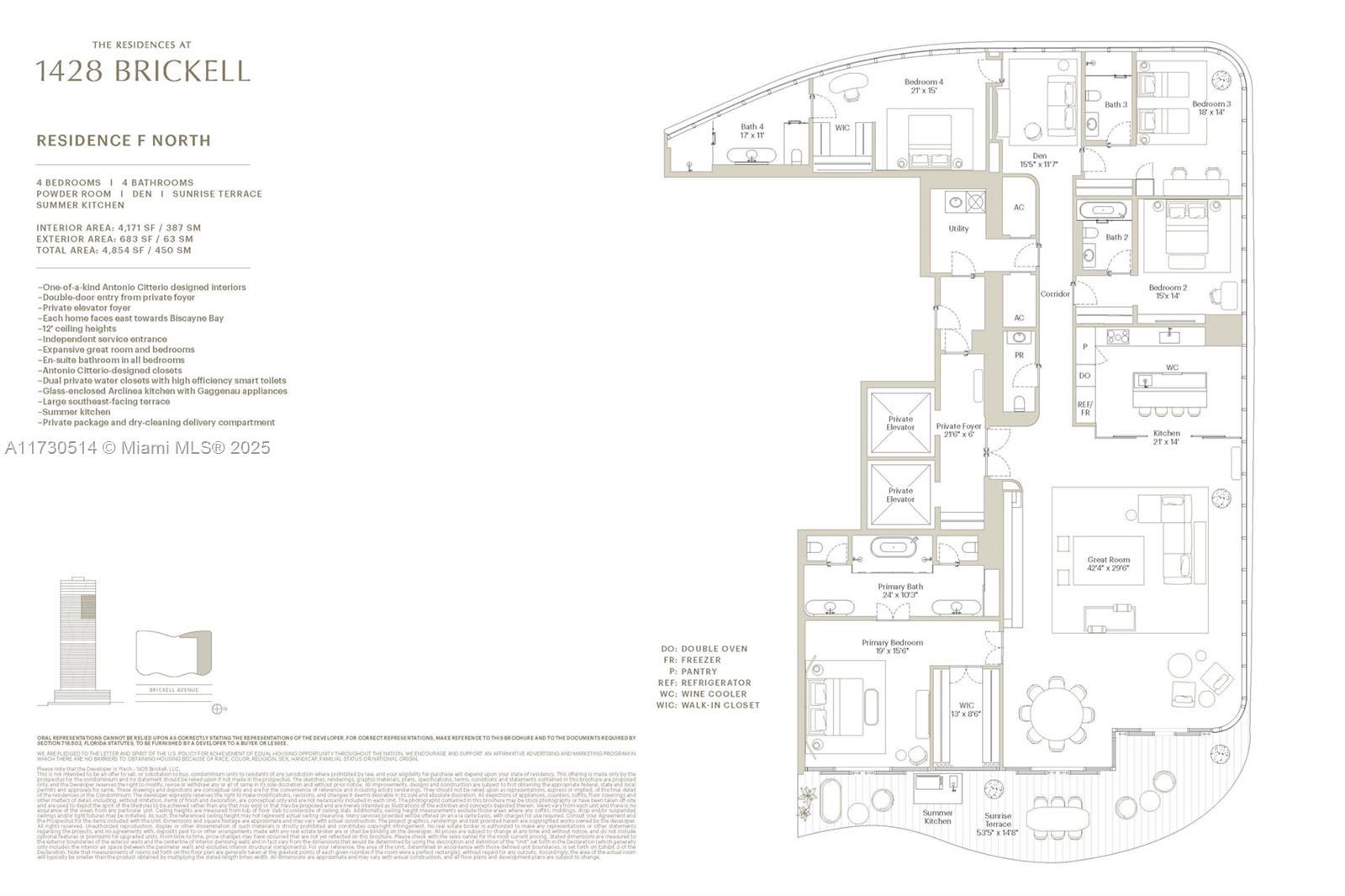 Introducing an elegant 4-Bed, 4-Bath home at The Residences at 1428 Brickell—an exclusive collection of 189 residences designed as a private sanctuary within Miami’s skyline. This expansive 3,436-SF residence, curated by ACPV Architects, boasts 11-ft ceilings, an Arclinea kitchen, a deep sunrise terrace with summer kitchen, a private elevator foyer with two elevators, and Citterio-designed signature pieces. Enjoy 80,000+ SF of amenities, including a rooftop pool, two-story owners club, and a full floor dedicated to health & wellness. The Resort Deck offers family-focused spaces with a pool, cabanas, a children’s learning center, cinema, and more.