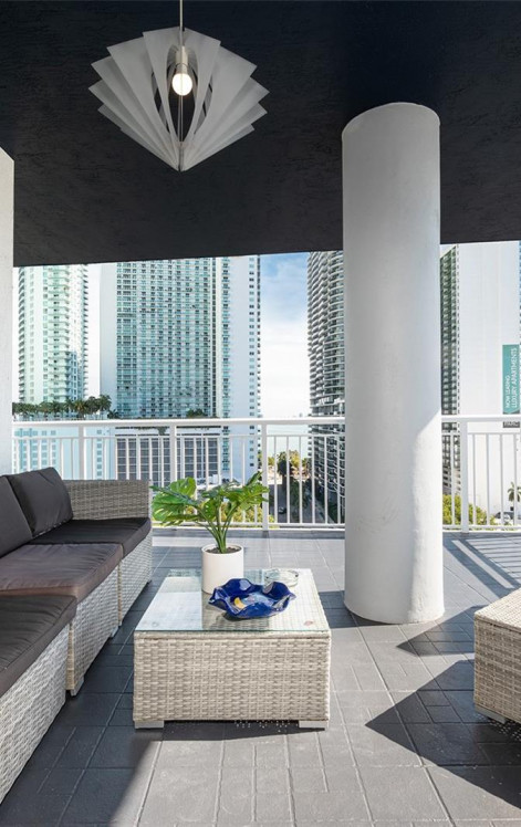 Renovated 3 bedroom, 2 bathroom corner unit offers over 1,300 sqft of thoughtfully designed living space. Enjoy two balconies, including an expansive wraparound balcony perfect for entertaining or relaxing. The unit features a split-bedroom layout, a walk-in closet, and custom-designed closets in the bedrooms. The bathrooms showcase elegant European fixtures, vanities, and large-format stone finishes on the walls and floors. The modern kitchen is beautifully appointed with sleek stone countertops, backslash and minimalist Design with wood cabinetry, combining both style and functionality. Additional conveniences include high-impact windows and an in-unit washer and dryer. All wood Doors. This property includes the luxury of two assigned covered parking spaces.