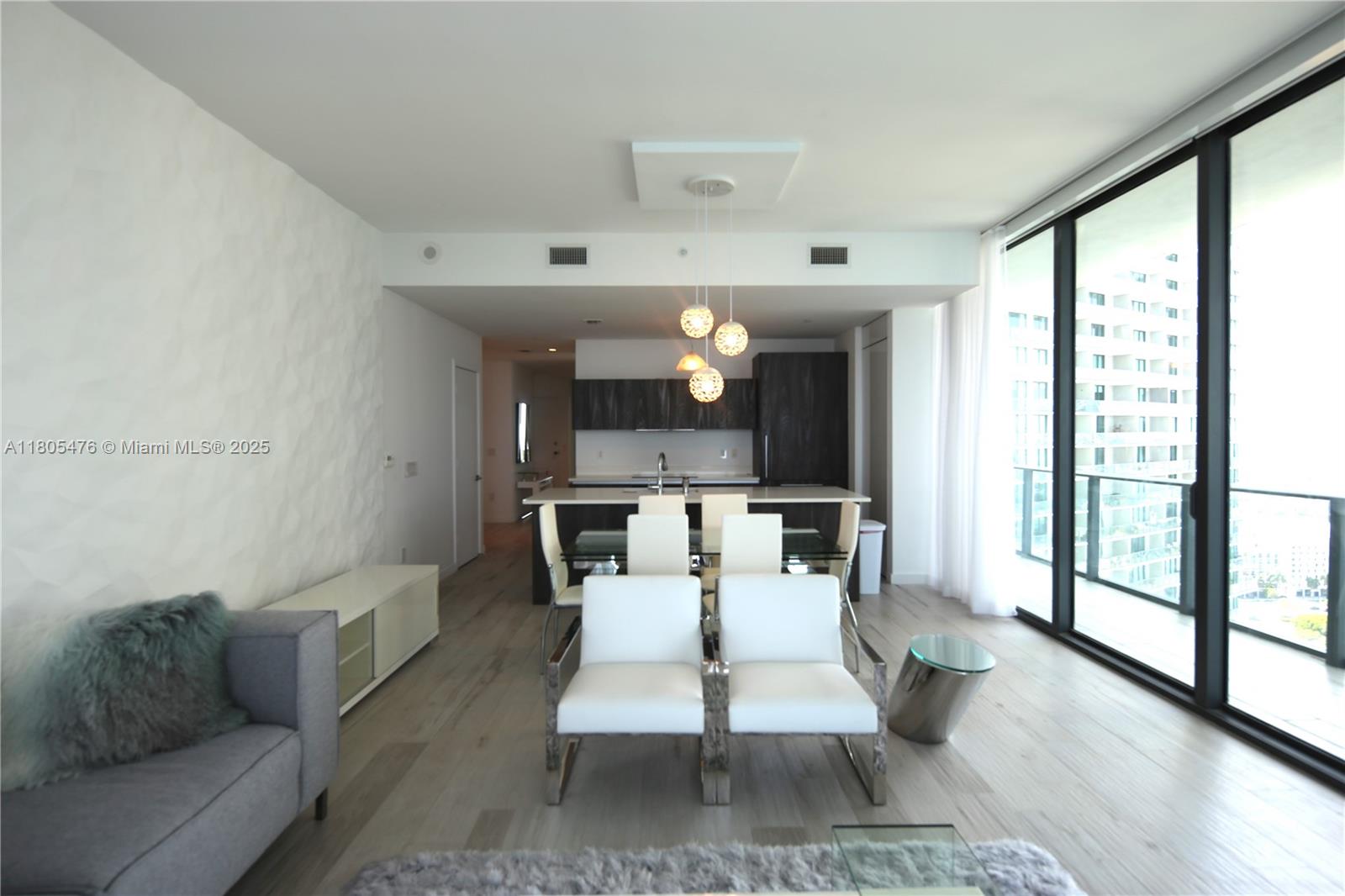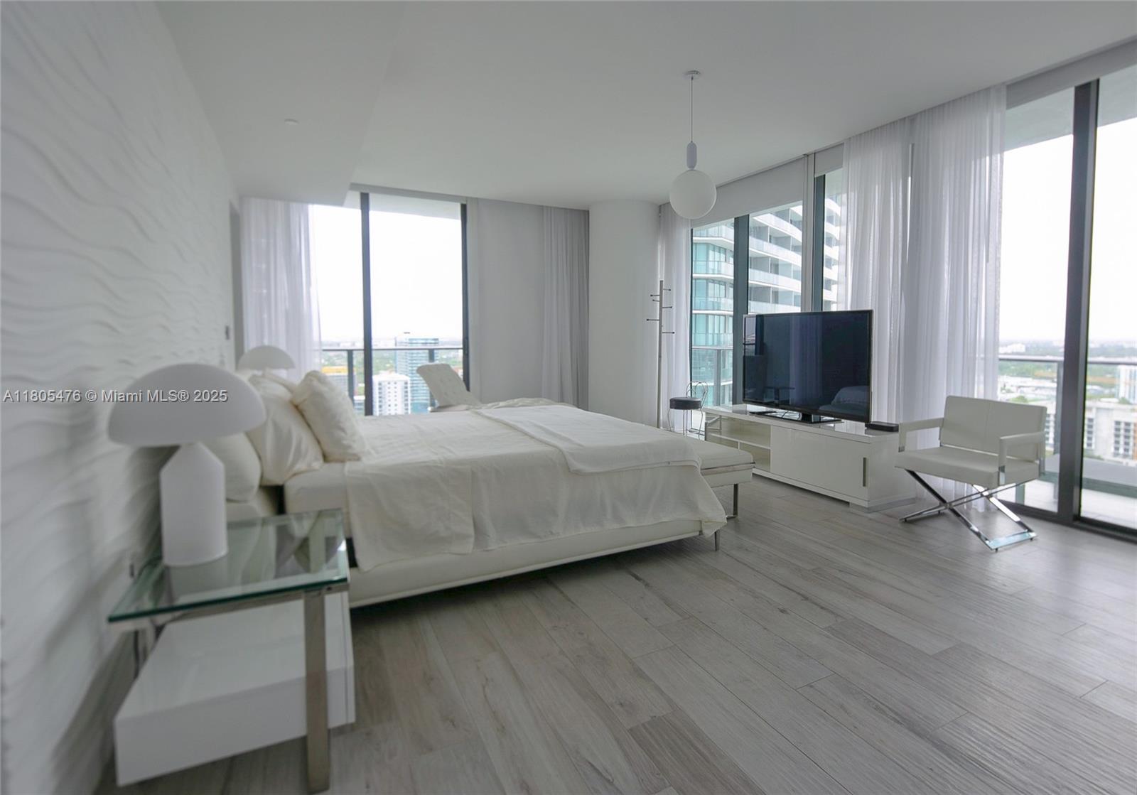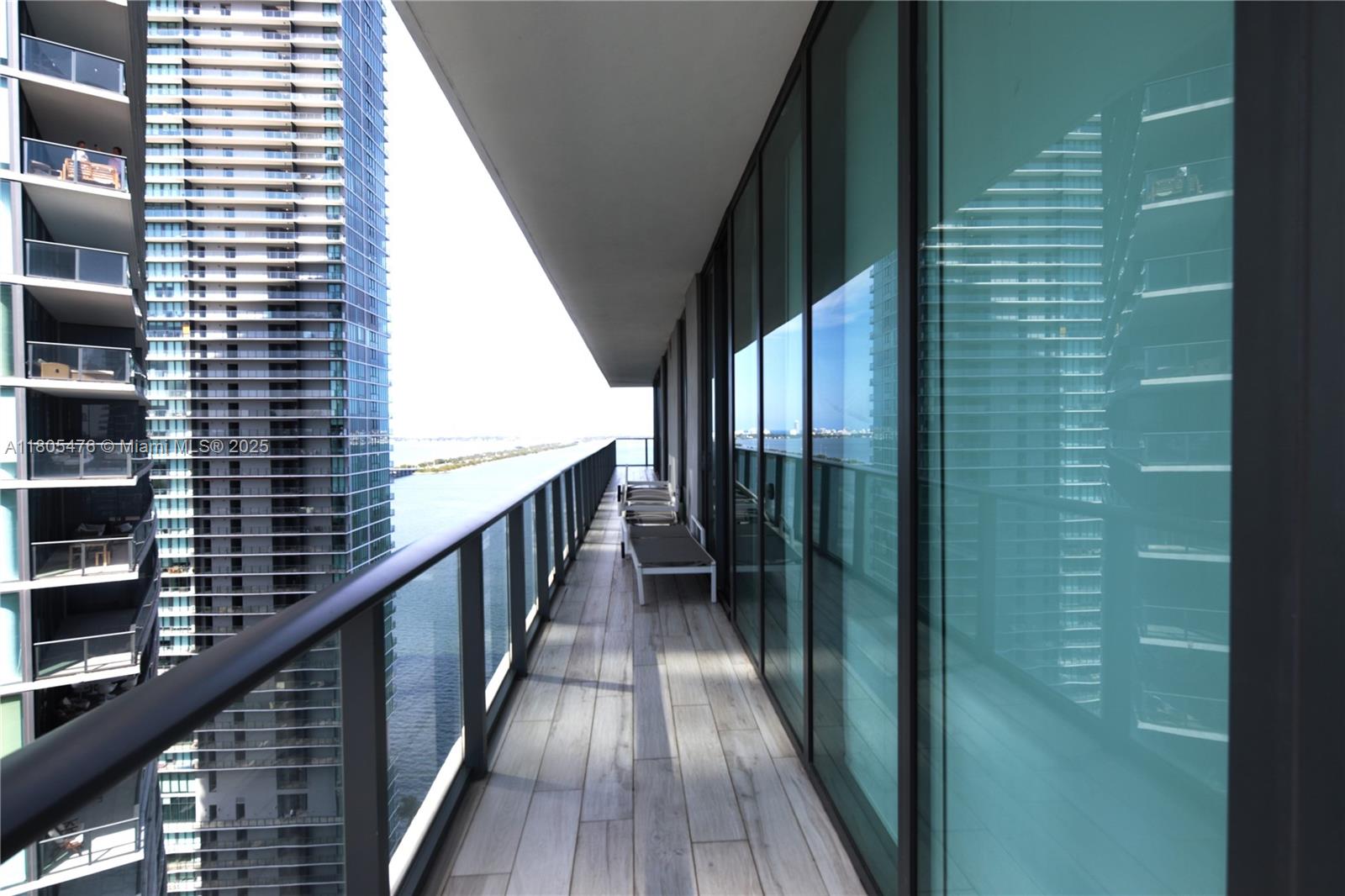 Breathtaking Bay & Ocean Views – Designer Residence with Expansive Wraparound Balcony Exceptional residence custom-designed transforming the original 3-bedroom layout into a luxurious retreat featuring a dramatic and spacious primary suite a second full bedroom a private den/home- office, generous storage. Three-dimensional accent walls in primary suite living room and private elevator foyer. Floor-to-ceiling glass opens to a spectacular 900 sq ft wraparound balcony providing sweeping sunrise and sunset views from the 26th. floor of Biscayne Bay and ocean. Kitchen with premium European appliances, custom cabinetry. Additional highlights include electric window shades, elegant designer finishes, and a large laundry area with full-size washer/dryer, laundry sink, and extra closet space.