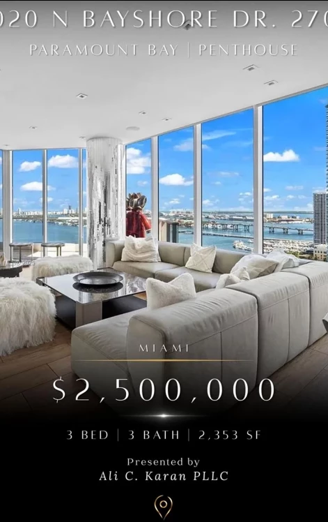 One of the most spectacular units in Paramount Bay, where no expense has been spared. This unique, flow-through furnished designer residence features 3 bedrooms, 3.5 bathrooms, and a den with unobstructed views of Biscayne Bay, the ocean, and the city. Approximately 2,353 sq. ft. of pure luxury and exquisite taste, including designer lounge lighting, electric shades, and top-quality millwork—just to name a few. This unit includes 4 parking spaces and 2 storage rooms (an estimated $200,000 value).