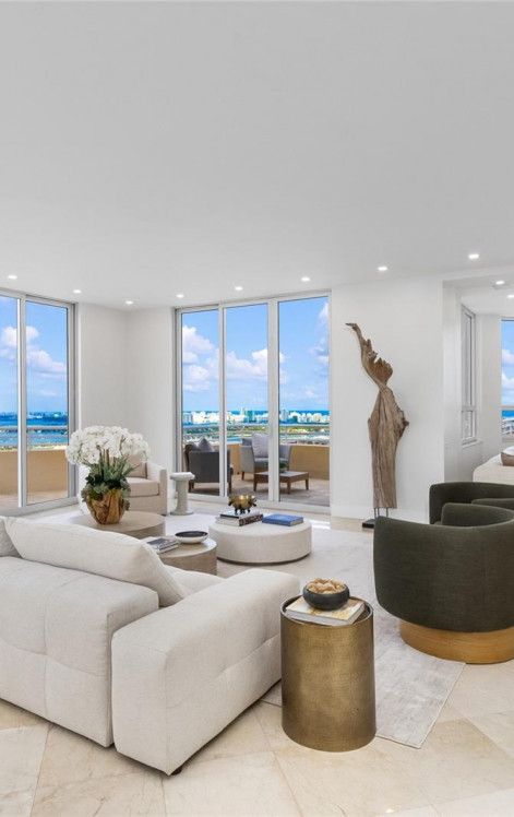 Discover the pinnacle of island living within walking distance of Brickell and Downtown Miami. This expansive two-story House in the Clouds features 5,097 interior sqft, 5 beds, 5.5 baths, an elevator, and balconies set against mesmerizing views of Miami's skyline, Biscayne Bay, Miami Beach, and the Atlantic Ocean. The open, split-floorplan showcases generous living/dining spaces complemented by floor-to-ceiling windows. Each spacious bedroom has its own ensuite bath. With two Live-In / Nanny rooms which are not included in the total bedroom count, this massive unit accommodates families of all shapes and sizes. Two Tequesta Point offers resort-style amenities including a heated pool, tennis and basketball courts, gym and spa, concierge and valet, BBQ area, media room, and kid's playroom.