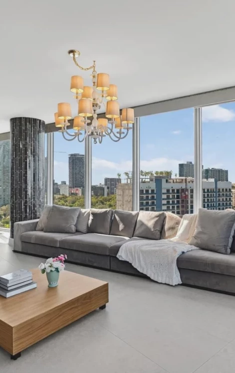Step into a corner residence wrapped in floor-to-ceiling glass, where the light shifts throughout the day and the city opens up before you. From golden-hour bay reflections to the sparkle of evening skyline views, the living area becomes a quiet pause in the middle of Miami’s energy — a place that feels both calming and inspiring the moment you walk in.