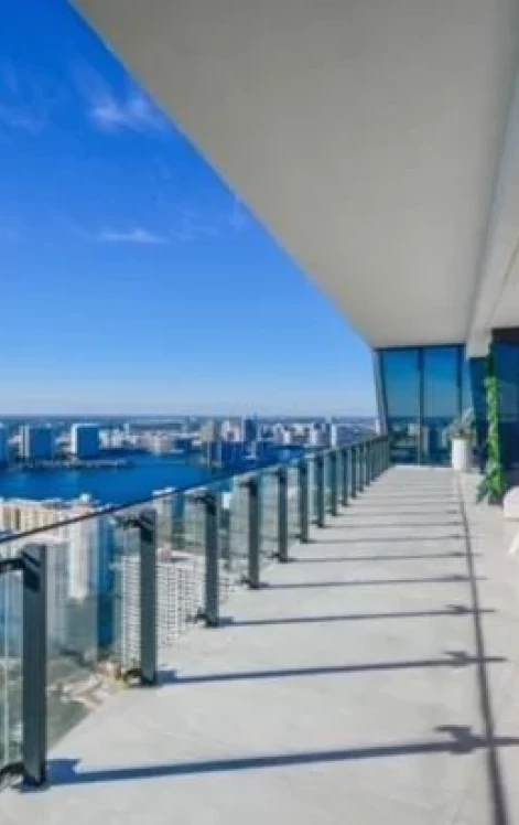 Enjoy unobstructed City, Intracoastal, and some ocean views from this high-floor corner residence in Muse Sunny Isles Beach. This remodeled with designer finishes 2 bed and 2,5 bath smart home unit with private foyer entry, 12’ ceilings, and gourmet kitchen. The floor plan was improved by expanding the living room, Italian porcelain floors throughout, bubble water panel with LED lights, handcrafted onyx in the guest bathroom, bamboo wallpapers, black marble slabs give the elegant covering of the columns at the balcony, and Italian doors. Large outdoor living space w/summer kitchen. With only 63 ultra-luxury exclusive residences Designed by Carlos Ott, an edge pool and spa overlooking the Atlantic Ocean, a State-of-the-art fitness center, and a Fully automated parking system.