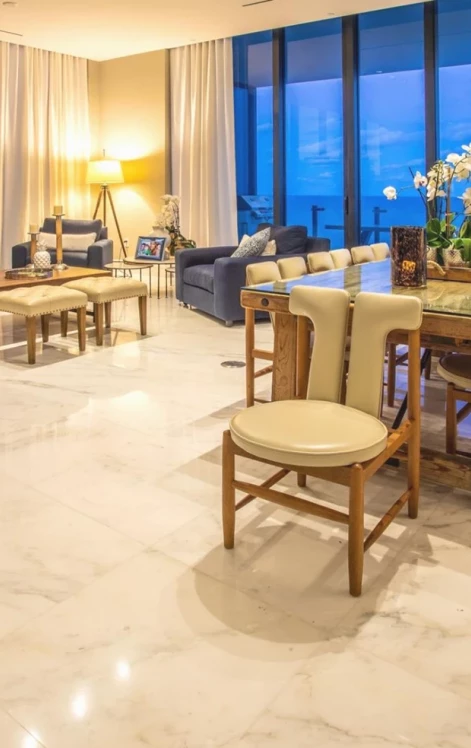 As you enter through a private elevator foyer, you’re greeted by floor-to-ceiling glass walls that frame panoramic ocean view, flooding the space with natural light. The open-concept living and dining area, custom lighting, and sleek architectural details.