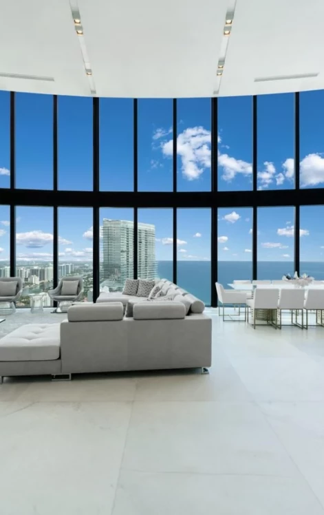 Crown Jewel Penthouse at Porsche Design Tower. This 2-level oceanfront residence features soaring 22-ft ceilings, custom wet bar, 98" Sony TV, MiaCucina kitchen with Wolf & Thermador appliances, & a striking Cetta 1800-bottle wine cellar. The primary suite includes Ornare closet, office & gym. Expansive terraces boast a mosaic-tiled pool, fire pit & summer kitchen. Fully Lutron automated Savant, 14 TVs, 3 fireplaces & 4-car sky garage with private elevator. A mansion in the sky, completely reimagined turnkey with exquisite upgrades & flawless finishes. This smart home showcases breathtaking ocean, city & Intracoastal views—set in one of the worlds most exclusive boutique buildings with unmatched privacy & the iconic Dezervator that seamlessly parks you & your car directly inside your home.