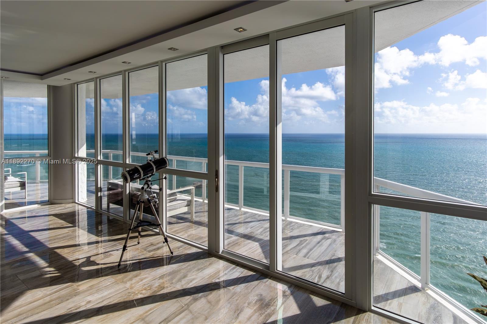 The grand entry opens to a light-filled living and dining expanse framed by floor-to-ceiling glass. A wrap-around balcony offers immersive ocean views from every angle. This level features a sophisticated junior suite with a private bath and balcony access, a second designer bedroom, a powder room, and a gourmet kitchen nook. Every inch has been professionally curated with high-end finishes for a turnkey transition.