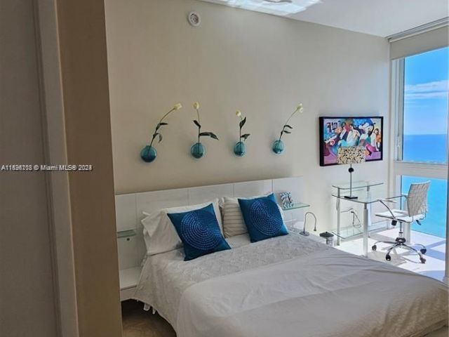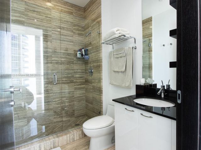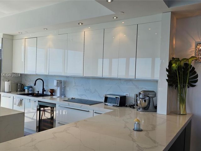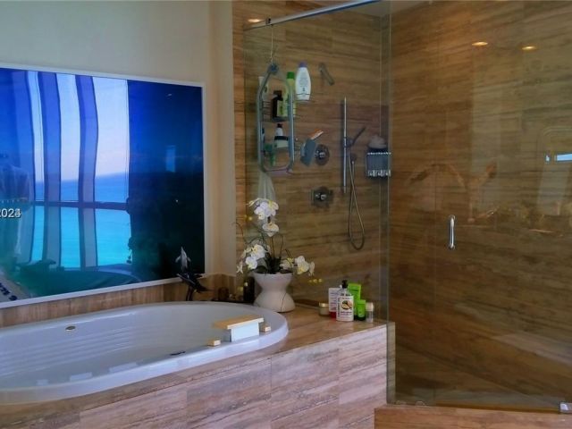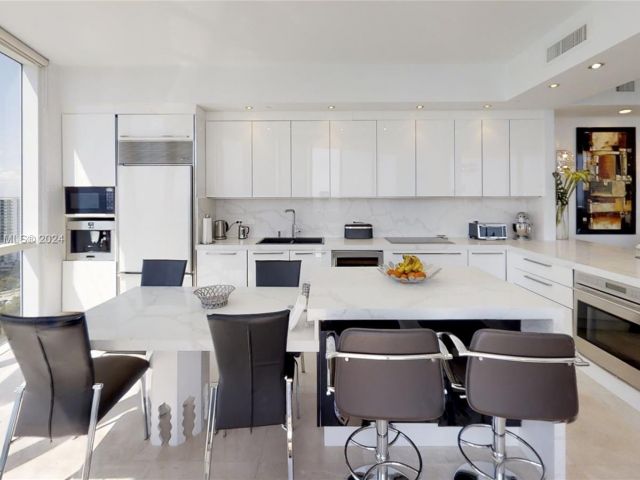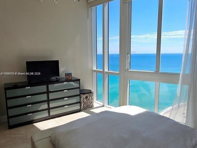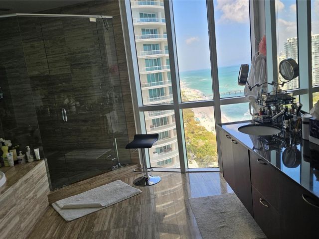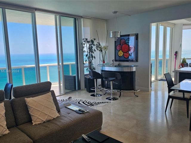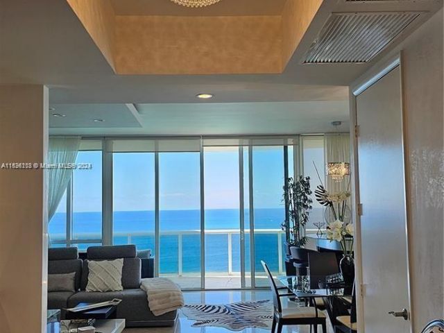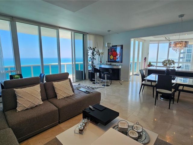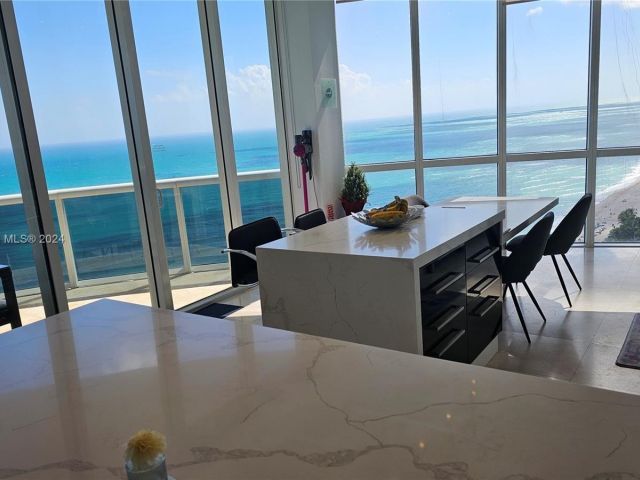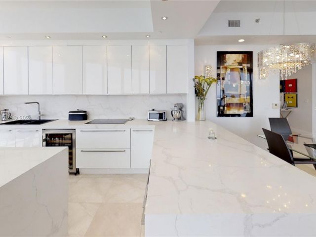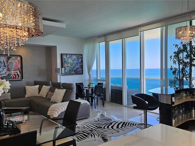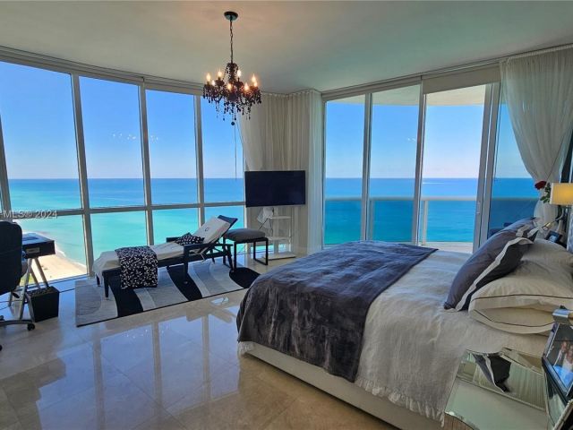 The kitchen wall was taken down to maximize the breathtaking direct ocean views. This spacious 3,000 sqft split-floor plan offers an endless balcony, marble floors, and stylish chandeliers in all three master bedrooms. Features include a private elevator, upgraded kitchen, and walk-in closets in every bedroom. Large laundry room with a private trash chute. Building amenities include a heated lap pool, jacuzzi, gym, massage room, business center, and a restaurant on-site.