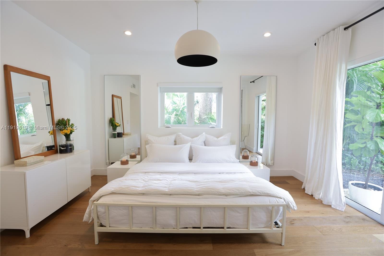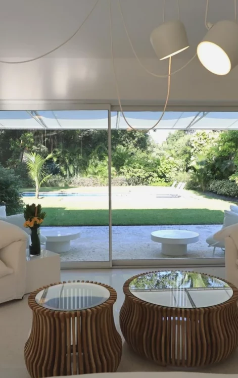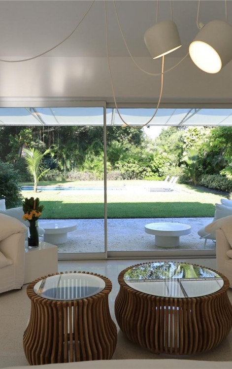 Exquisitely fully furnished modern living space with high ceilings and open airy spaces. White throughout, including large cool terrazzo tiles in the living area and wide-planked Siberian white wood in the bedrooms. High impact windows and doors and custom closets. Immaculately maintained high-end kitchen including marble counters and top of the line appliances. Large lush private canopied/tropical backyard with mature trees and nearly 1/2 acre fenced property with saltwater heated pool.
