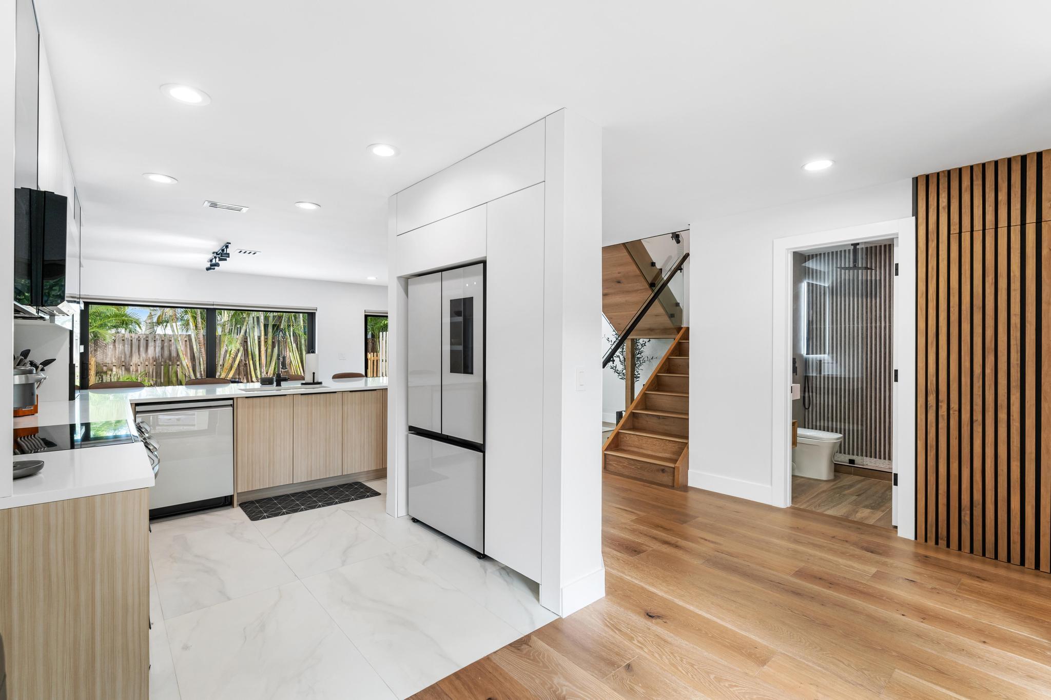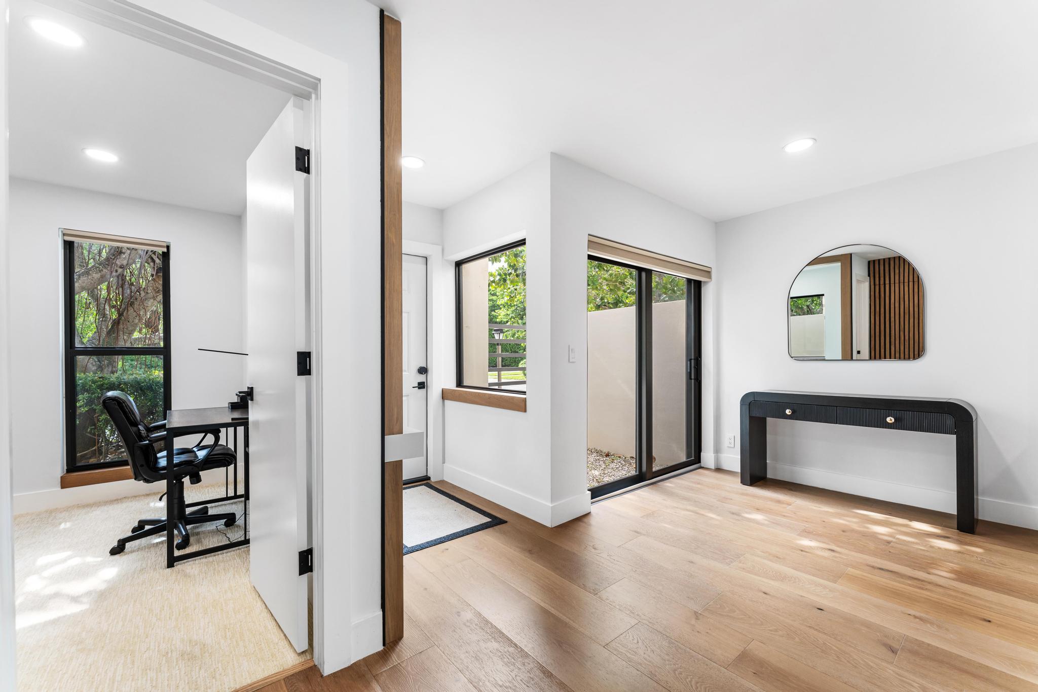Beautifully remodeled 3-bedroom, 3-bath townhome located directly across from the beach and steps from Palmetto Park Rd's shops and restaurants. Features include an open floor plan, one bedroom downstairs, impact windows, new kitchen, wood floors, new AC, and a private fenced backyard with barbecue. Spacious balcony with treetop views. Available furnished or unfurnished. Minimum 6-month lease or annual rental Small, private 4-unit community with low-maintenance living.