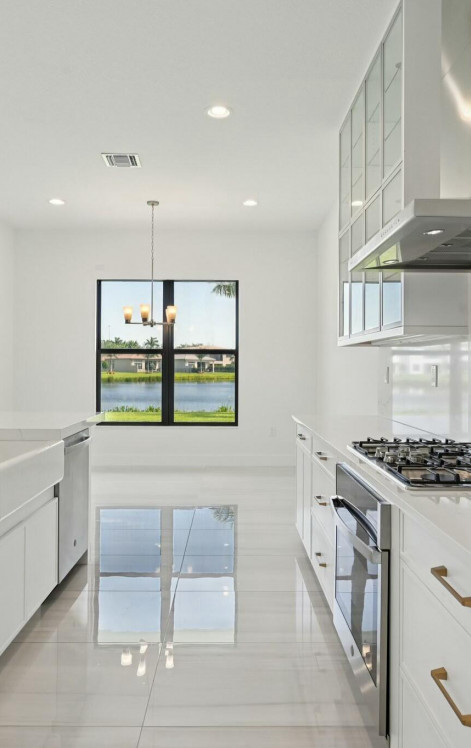 Come & See this Brand New Lakefront Home | 5BD + Den | Designer Finishes Throughout. Stunning new construction home with expansive long lake views and premium upgrades throughout. This spacious 5-bedroom home showcases a rare his-and-her bathroom layout in the primary suite, paired with an oversized walk-in closet. Porcelain tile flooring flows seamlessly through the main level, complementing a chef-inspired kitchen with an apron-front sink, full backsplash, gas cooktop, and elegant gold hardware. All bathrooms feature luxury finishes and refined gold accents. Impact glass and a thoughtfully designed open floor plan blend elegance with everyday comfort, all within a community that truly has it all!