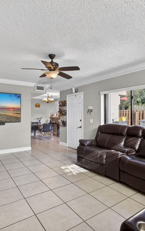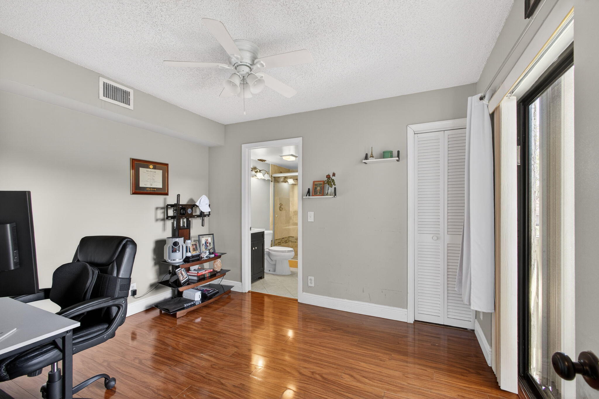 A lime tree greets you as you enter the courtyard of this townhouse at Boca Rio North in Boca Raton. Beautiful stone countertops & backsplash, along with white Shaker cabinets & stainless-steel appliances accent the kitchen. Consistent tile flooring downstairs, with a full W/D in the half bath & a super spacious living room. Sliders in both the kitchen & living room are great for convenience & natural light. Consistent wood flooring throughout the staircase & upstairs twin en suites. The primary bedroom has a walk-in closet. The primary bathroom has a large vanity. The second bedroom has a walk-in shower with floor-to-ceiling tiles & river rocks. Balcony access is enjoyed from both bedrooms. Super amenities include: 2 pools, gym, hot tub, saunas, steam rooms, 4 tennis courts & 2 handball/