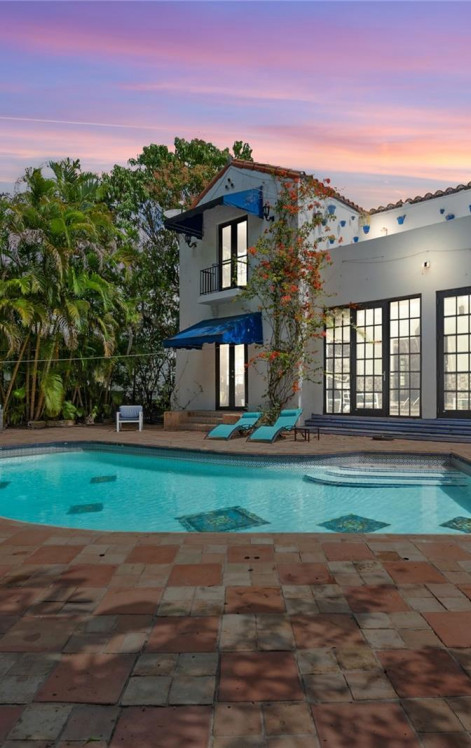 Experience timeless elegance in this stunning Coral Gables Mediterranean Villa, featuring exquisite Moroccan details on a coveted corner 1/2 acre lot. A charming courtyard entry leads to sunroom w/ arched windows & tranquil fountain. The grand living room boasts soaring beamed ceilings, carved fireplace & adjoining formal dining room. Beautifully crafted wood-scroll staircase ascends to the master suite, complete w/ fireplace, rich wood floors & private terrace overlooking the sparkling pool & serene fountain. The enchanting carriage house/guest cottage have impact windows & doors. Lush landscaping, peaceful pond & charming gazebo complete this architectural masterpiece, originally designed by renowned architect Martin Luther Hampton. Walk to Granada Golf Course, tennis & restaurants.