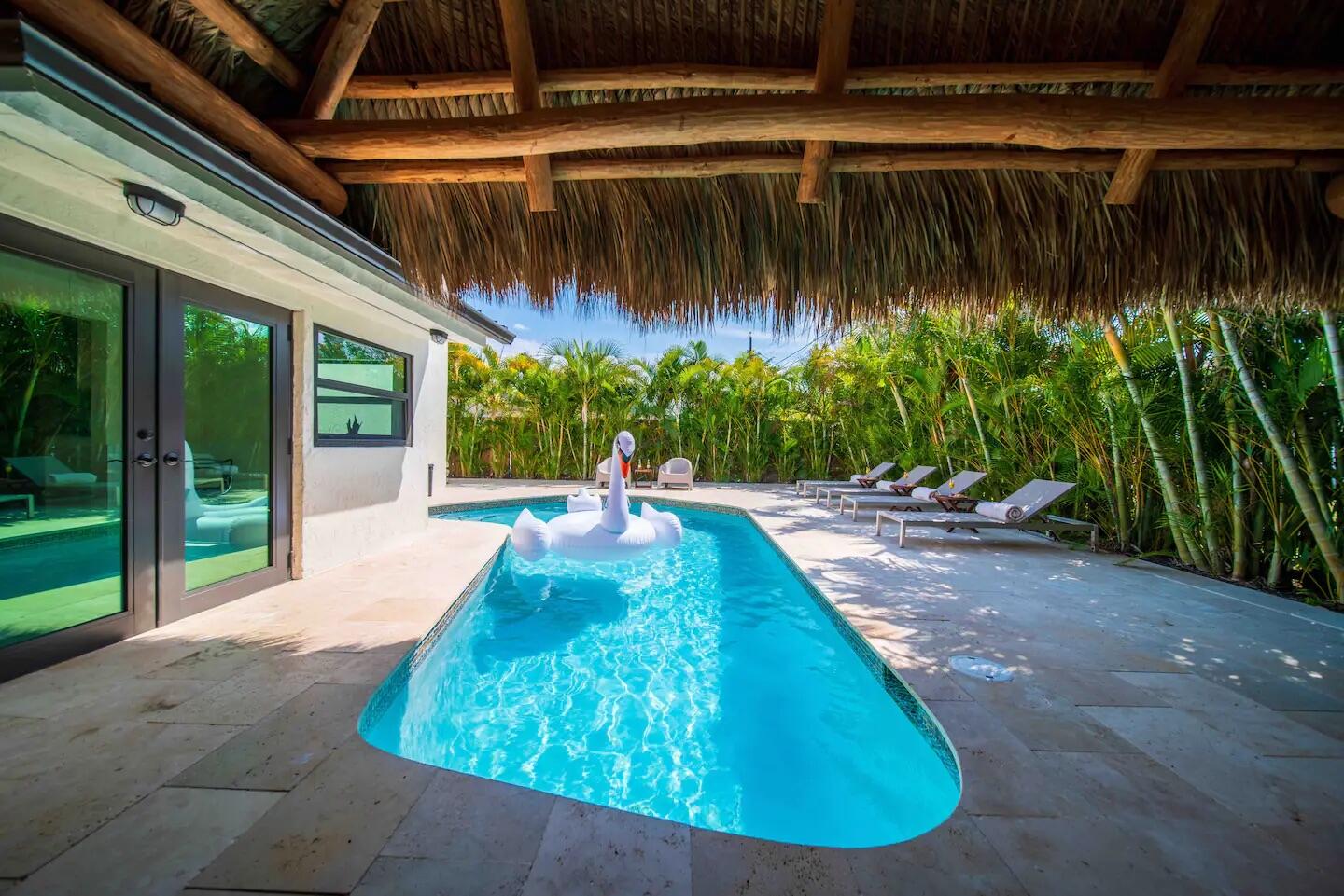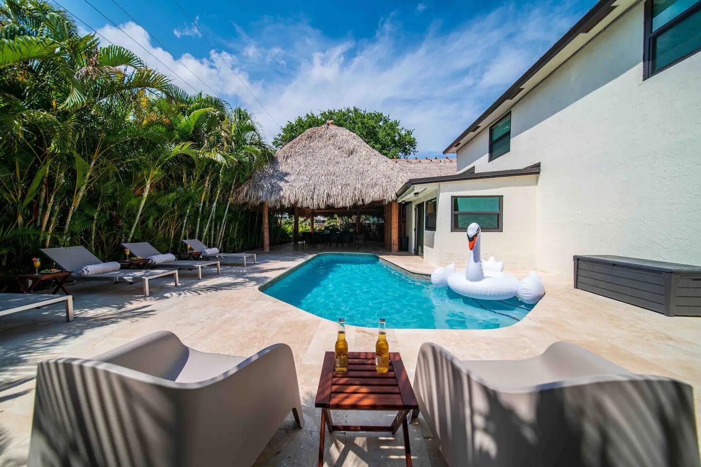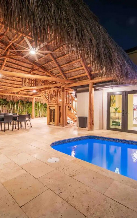 : AVAILABLE FOR SEASONAL RENTAL,OFF SEASONAL RENTAL OR ANNUAL RENTAL. PRICES VARY/FLEXIBLE ON LEASE TERM.*PRICE LISTED IS ANNUAL RENT/OFF SEASON SUMMER RENT. Spacious 4 bedroom 3 bathroom Tiki home located minutes from Delray Beach & Downtown Atlantic Ave. Our recently renovated home includes 3 suites with king sized beds/private bathrooms and 1 room with 2 queen sized beds & a sofa bed. Large kitchen, dining/living area leads to private back yard featuring a stunning Tiki Hut & loft, saltwater heated pool surrounded by palm trees.