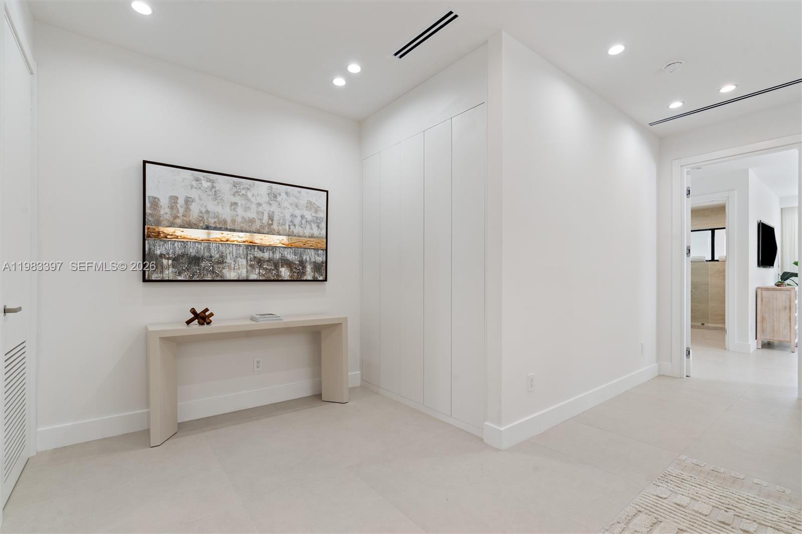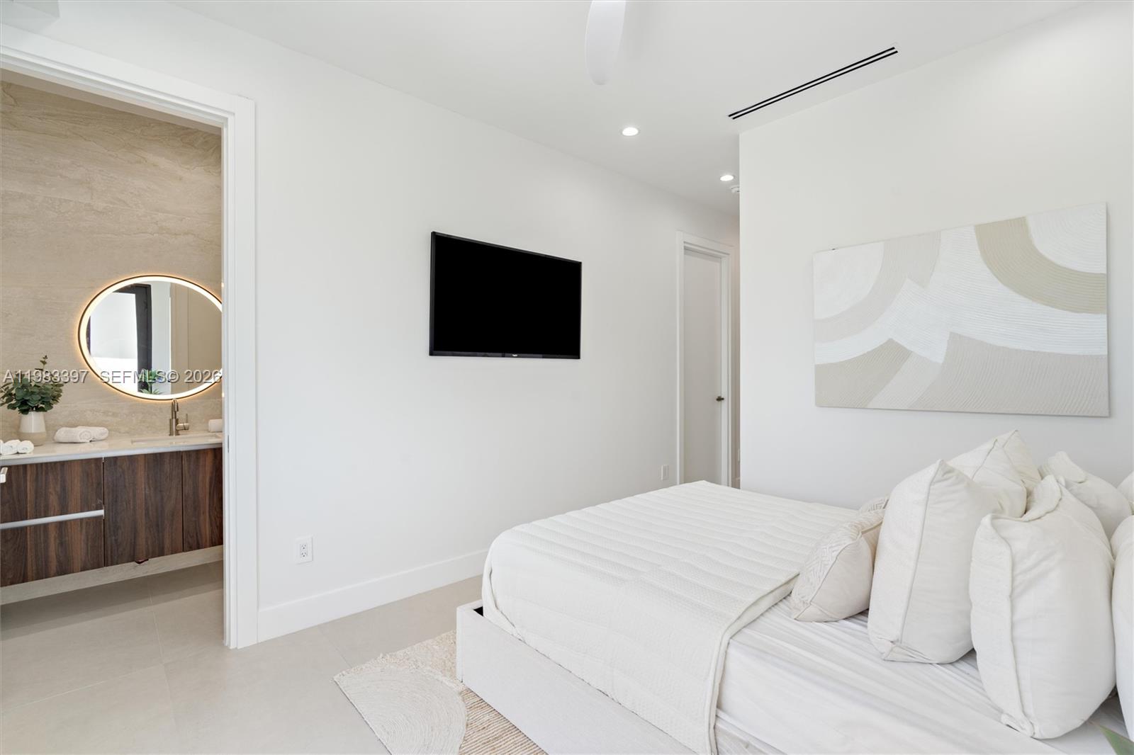 The home features a flush modern kitchen with panel-ready JennAir appliances, custom accent walls, and a built-in TV in the living room. Enjoy in-ceiling speakers throughout the home, a full smart home system, security cameras, and Ring doorbell system.