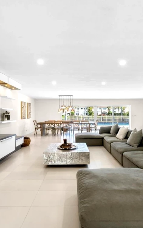 Modern waterfront residence with private dock and deck, offering open water views and a beautifully designed backyard setting. The pool, expansive patio, and dedicated outdoor dining area create an ideal space for entertaining or enjoying the waterfront backdrop. Inside, the open layout connects the main living and dining areas with abundant natural light throughout, along with an additional family room just off the main living space. The main kitchen is equipped with premium appliances, a large island with cooktop and seating, and ample cabinetry. Behind the kitchen is a separate pantry and prep workspace complete with a second refrigerator, sink, and additional storage. The full laundry room and garage are conveniently located just off the kitchen. A private guest suite with full bath is also situated off this wing of the home. The primary suite includes dual vanities, soaking tub, separate shower, oversized walk-in closets with built-ins, and direct access to the pool. Two additional bedrooms share a Jack and Jill bathroom, each with generous closet space and a large connecting hallway closet. Additional highlights include a spacious circular driveway providing ample parking. A modern waterfront home offering functional design, generous living spaces, and exceptional outdoor amenities near the best of Hollywood.