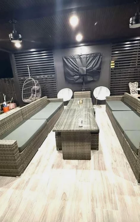 The open-concept living and dining areas seamlessly connect to a contemporary kitchen equipped with granite countertops and stainless steel appliances. Tile flooring on the first floor and a convenient laundry room upstairs. The garage includes air conditioning, and the backyard features a covered pergola deck