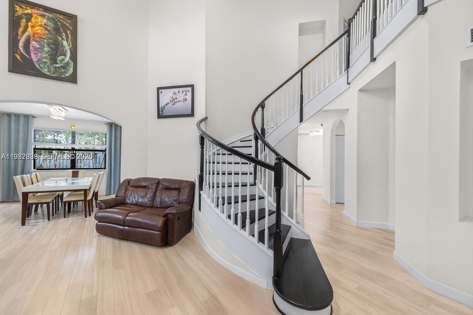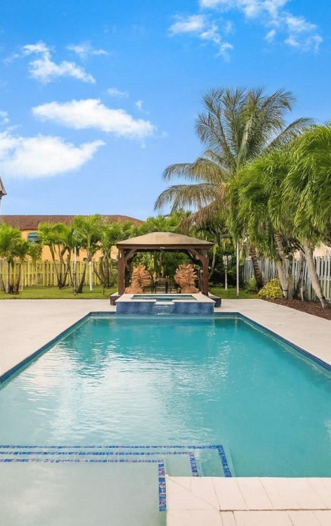 Discover the perfect blend of space, elegance, and resort-style living in this stunning two-story home set on an impressive 11,980 sq. ft. lot. Boasting a 3-car garage and an expansive driveway, this residence offers both comfort and convenience for families, entertainers, and those seeking elevated living. With 5 bedrooms (one bedroom downstairs), 4 bathrooms, and 4,320 sq. ft. of living area, there is truly room for everyone.Step inside to find a beautifully updated kitchen and two remodeled bathrooms, all completed in 2022 with modern finishes and thoughtful design. Wood stairs and contemporary light fixtures add a sophisticated touch, enhancing the home’s warm yet refined ambiance. The outdoor space is a true Florida oasis. Enjoy travertine flooring throughout the backyard, an aluminum terrace, and a charming wood gazebo perfect for gatherings. Relax in your private pool and Jacuzzi, equipped with colored lighting and a propane gas heater—ideal for evening dips or weekend fun. Additional upgrades include two water filtration systems, a sprinkler system, and accordion shutters throughout, ensuring comfort and peace of mind year-round. Located inside a secure gated community, residents enjoy top-tier amenities including a gym, playground, community pool, and splash water park—everything you need for a vibrant and active lifestyle. This exceptional property offers the perfect combination of luxury, functionality, and outdoor enjoyment.