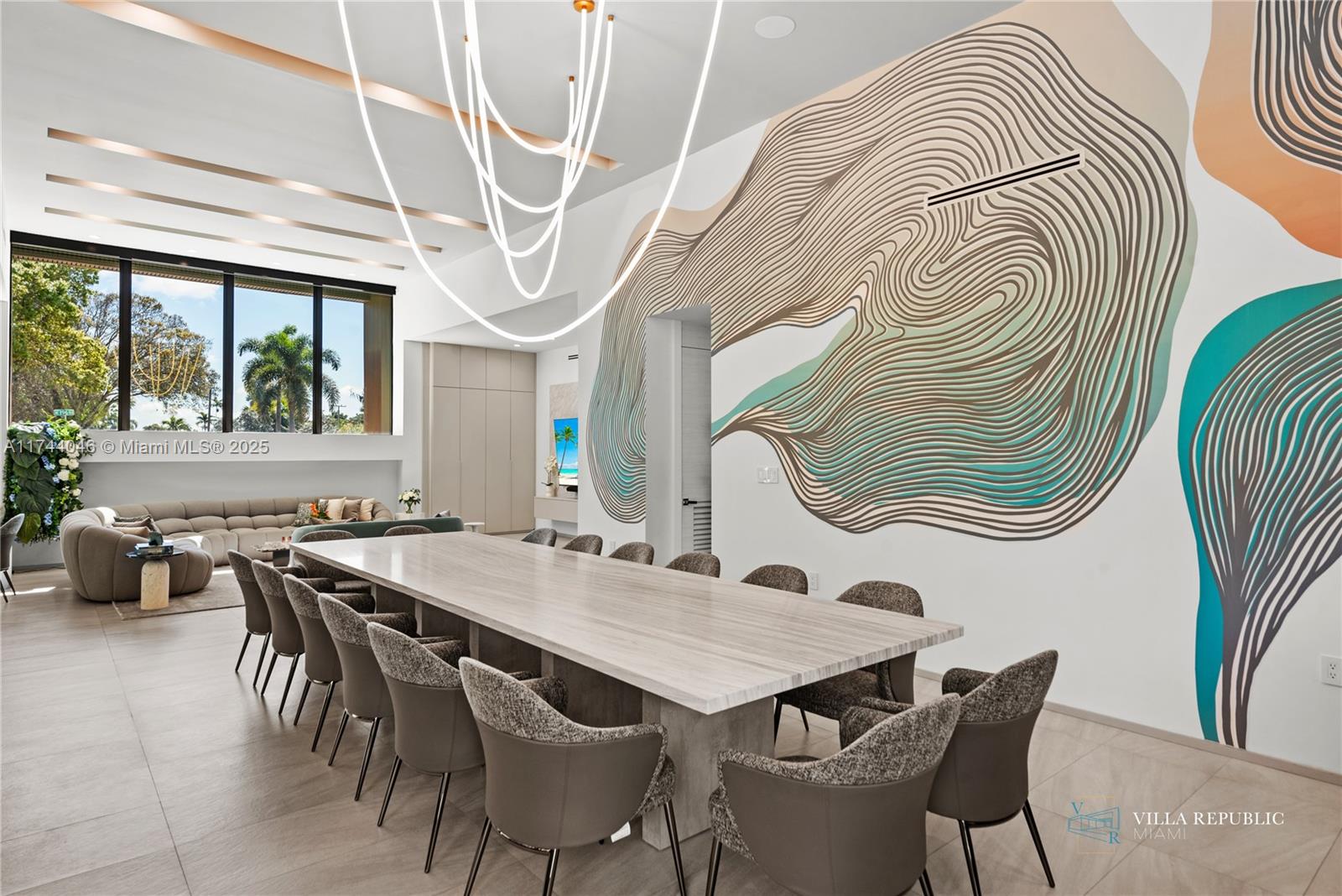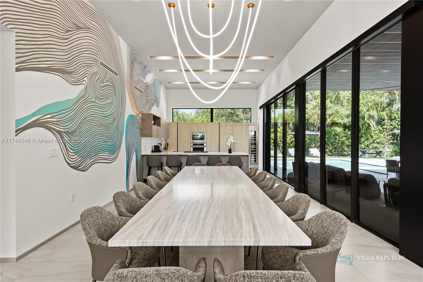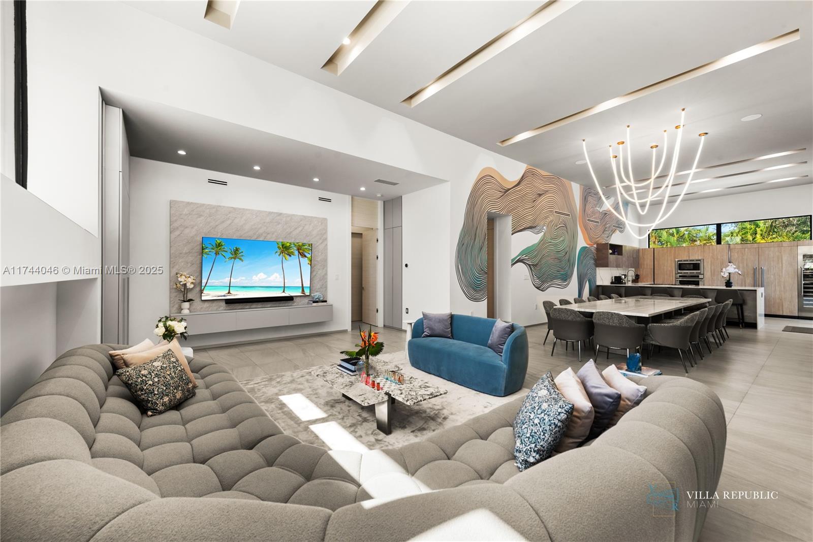 equipped with high-end appliances and a large island, flows into the living and dining areas,
