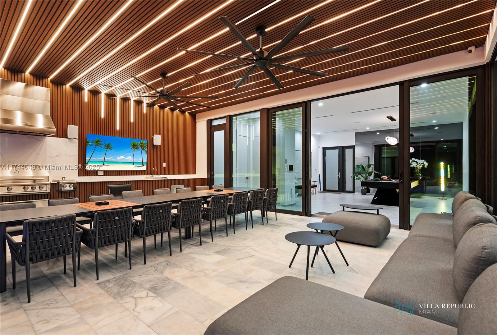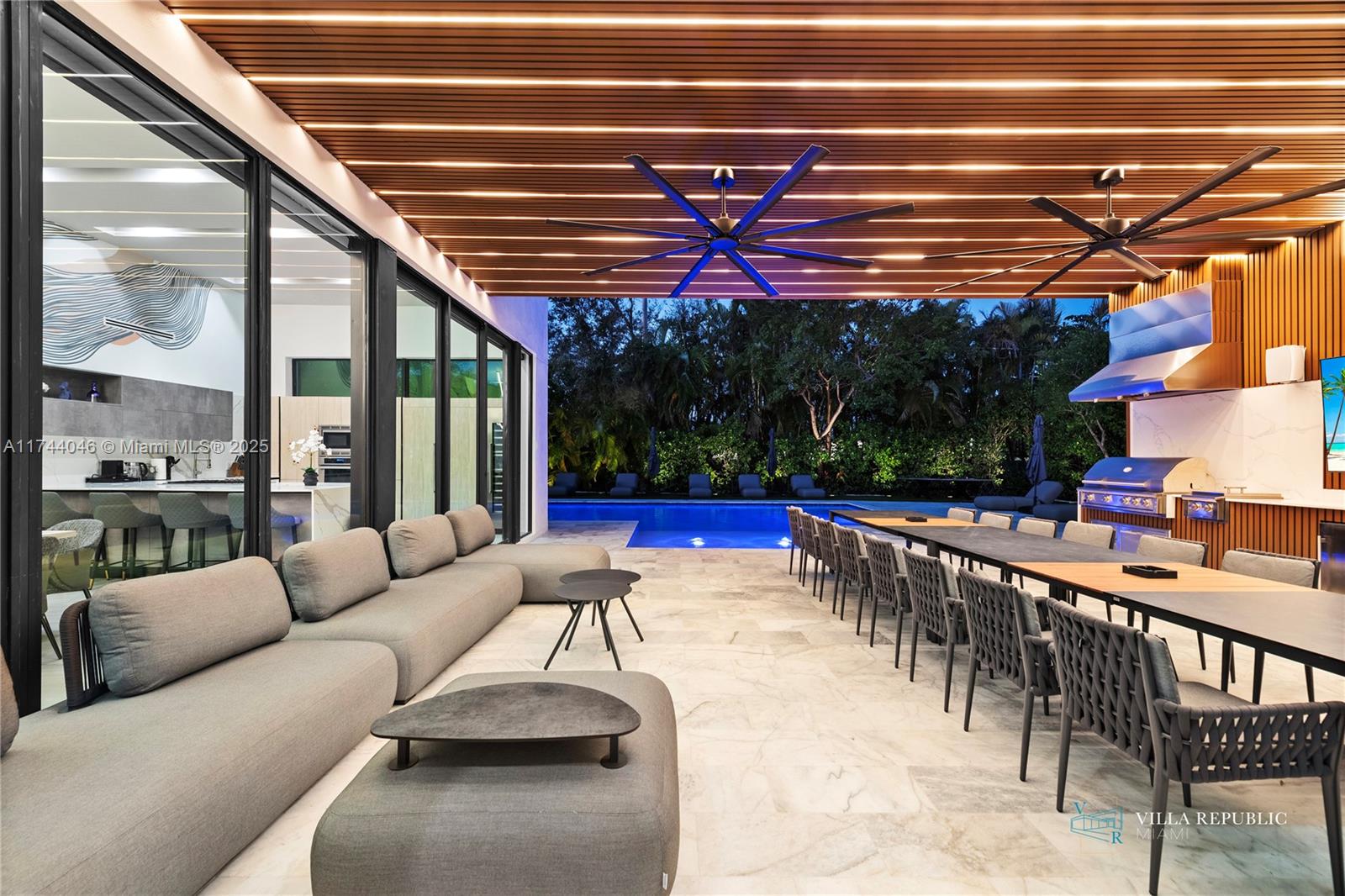 connecting the indoors seamlessly to the backyard oasis. The spacious gourmet kitchen,