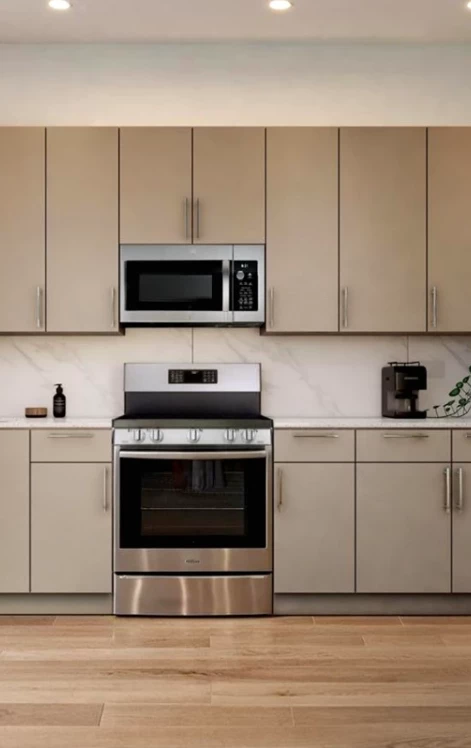 The Juniper model is a modern two-story townhouse offering 4 bedrooms and 3 bathrooms with about 1,500 sq ft of living space. It features an open-concept kitchen, living and dining area, contemporary finishes, stainless-steel appliances, impact windows and doors, and two private parking spaces.