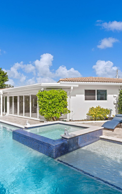 Experience luxury waterfront living in this breathtaking canal-front home featuring wide-water views, a sparkling pool & spa, private dock, and no fixed bridge ocean access. Split bedroom design, LED lighting, and elegant tile flooring. The chef's kitchen impresses with quartz countertops, 42'' white wood cabinetry, stainless steel appliances, and bar seating. Each bedroom includes its own en-suite for privacy and comfort. The primary suite offers custom built-in closets, a spa-style bathroom with dual vanities, frameless glass shower. Step outside to a stunning marble travertine patio with pergola, outdoor bar and kitchen, a reinforced seawall, impact windows and doors, and a desirable canal end lot. Ideally located on a quiet cul-de-sac just minutes to the beach Pompano Pier, boardwalk.
