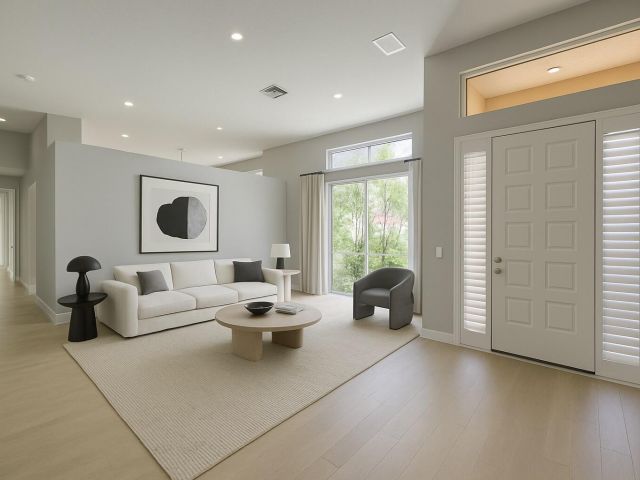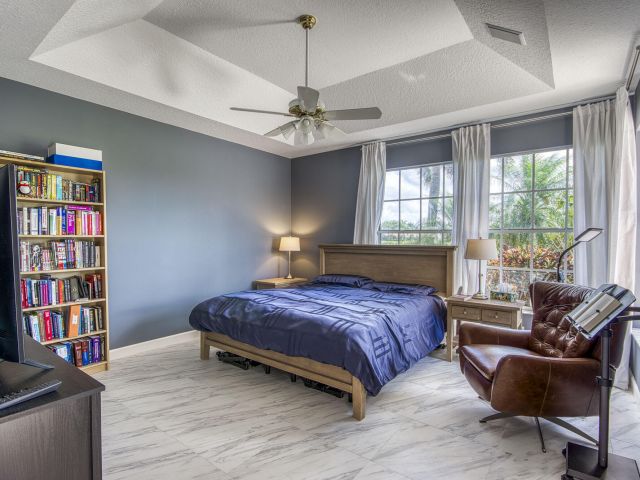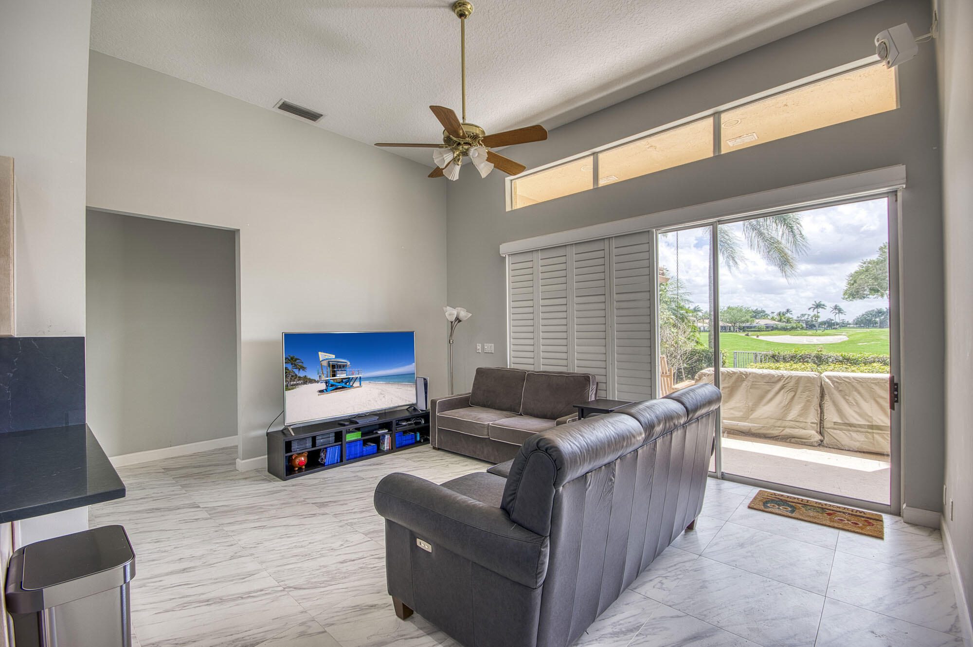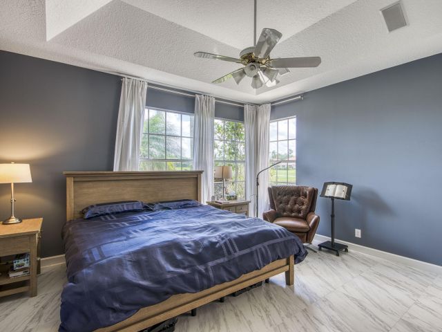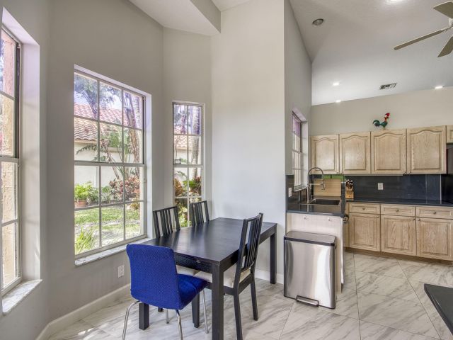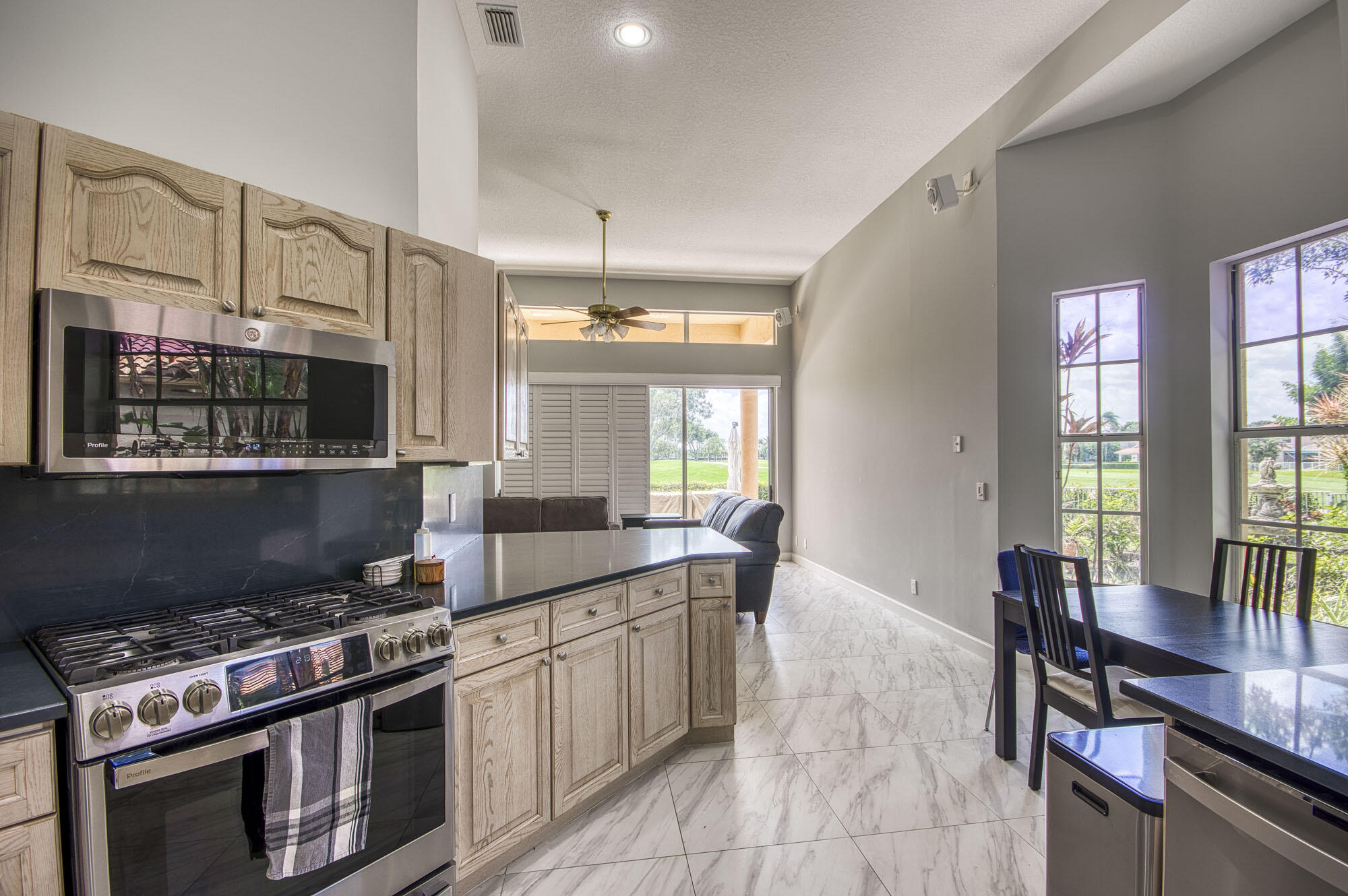 Located on a quiet cul-de-sac, this beautifully maintained home offers stunning golf course views and lush tropical landscaping. The spacious, open layout features vaulted ceilings and new porcelain tile floors throughout, with a bright and airy kitchen that includes 2022 stainless steel appliances, new black quartz countertops, and plenty of cabinet space. The family room opens to a large patio, perfect for entertaining or relaxing while enjoying view of the newly redesigned Heritage course, #1 & #9 fairways. The master suite features tray ceilings, large windows with natural light, and a walk-in closet, while the master bath includes a newly updated, walk-in shower, soaking tub, dual vanities, and a unique stained-glass window of an Ibis. The backyard is fully landscaped with