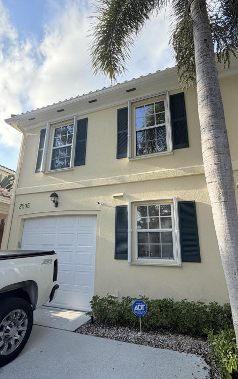 Beautifully maintained townhouse located in the highly sought-after community of Riverwalk. This spacious 3-bedroom, 2.5-bath home features a one-car garage plus two additional driveway spaces. The first floor offers tile flooring throughout, a laundry room with a basin sink, and a half bathroom. Large sliding doors open to a screened patio overlooking a generous backyard where pools are permitted. The kitchen is pristine with barstool seating, seamlessly flowing into an expansive living area perfect for entertaining or relaxing. Upstairs features real wood flooring, a large primary suite with a walk-in closet, double vanity, separate shower, and soaking tub. Two additional bedrooms and a full bathroom complete the second floor. Accordion shutters provide full storm protection, & cable