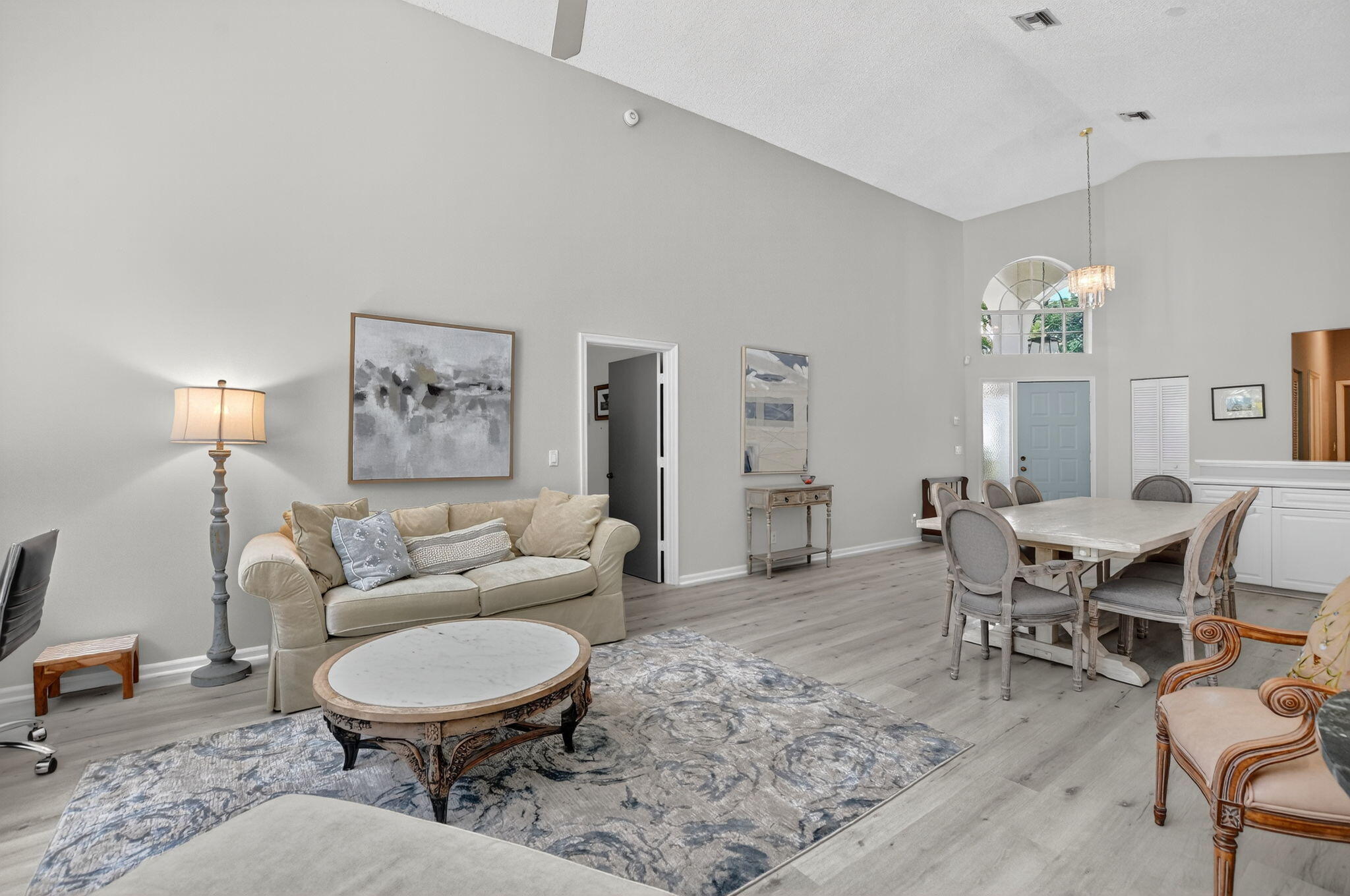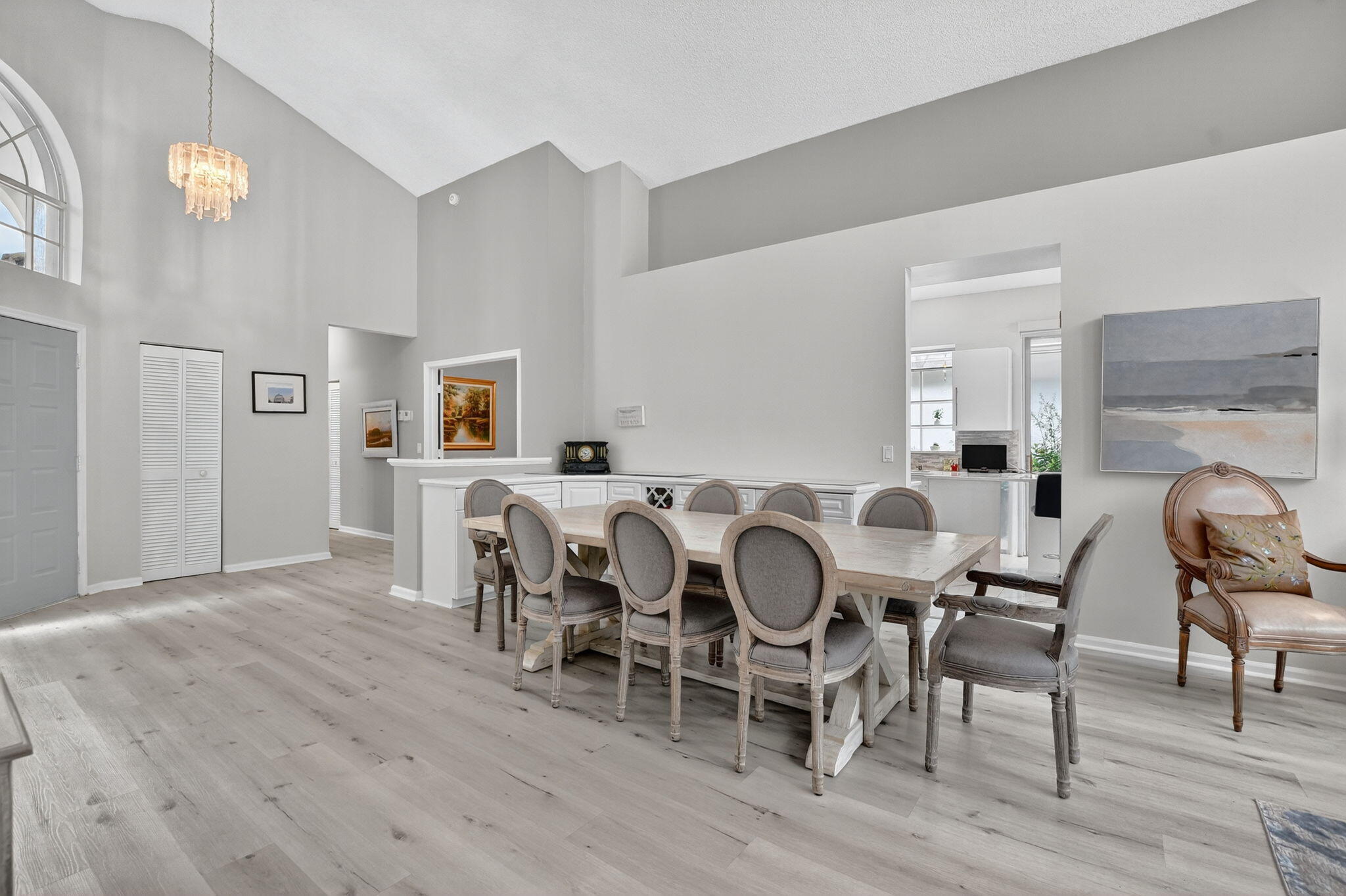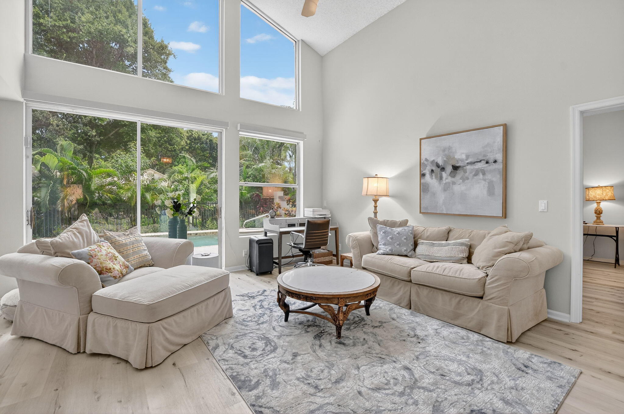 Welcome to this stunning one-story single-family home located in the desirable Village of Whisper Trace within the prestigious Broken Sound Country Club. Offering 1,838 square feet of beautifully updated living space, this 3-bedroom, 2-bath home features a thoughtfully designed split-bedroom floor plan and soaring vaulted ceilings that enhance the bright, open feel throughout. The renovated kitchen is a chef's dream, showcasing sleek white high-gloss cabinetry, elegant quartz countertops, and modern finishes. New flooring flows throughout the home, while both bathrooms have been tastefully upgraded with frameless glass shower doors and stylish fixtures. Step outside to your own private oasis -- a fenced backyard with a sparkling pool, perfect for relaxing or entertaining in complete