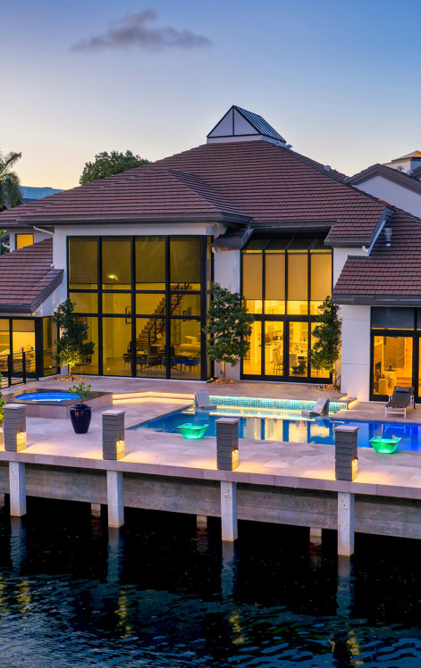 Blending contemporary architecture with lofty urban chic, this dramatic yachting estate offers a voluminous open floor plan with stunning interiors, serene water views, and direct ocean access. A massive glass grid entry with oversized custom double doors reveals a towering 30-foot foyer, which is a prelude to the voluminous expanse of this open-plan design. A skylit gallery sitting area is framed by twin suspended staircases with open cable rails and recessed stair lights. The dining area offers a floor-to-ceiling expansive grid window wall view of the sun-drenched pool and waterway. Soaring shiplap walls and bleached oak designed porcelain floors provide a modern farmhouse ambience.