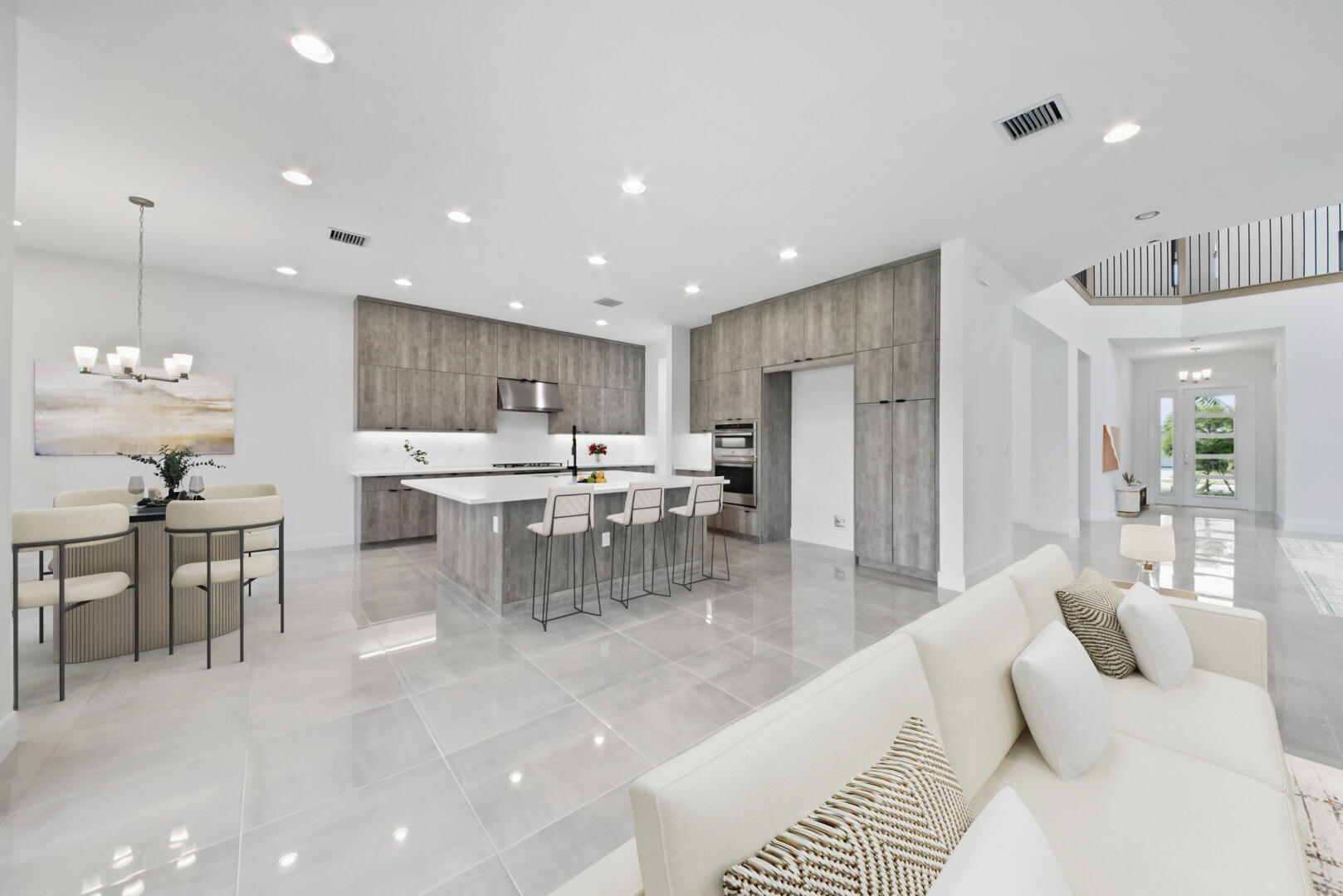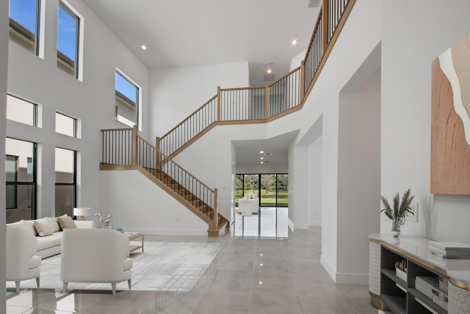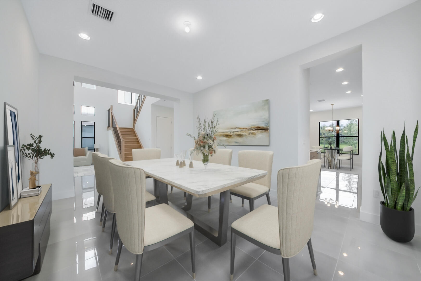 Welcome to this stunning Polynesia model in the sought-after community of Lotus Palm. The foyer leads to a formal living room with soaring two-story ceilings and an elegant formal dining area. The spacious family room flows seamlessly into an open chef's kitchen featuring quartz countertops, a center island with snack bar, stainless steel appliances, double ovens, a 5-burner gas range, and a sunny breakfast nook. The first floor also offers a cabana bath and a guest bedroom with an ensuite bath and walk-in closet. Upstairs, the luxurious primary suite impresses with a double-door entry, coffered ceiling, expansive walk-in closet, and his and hers bathrooms.