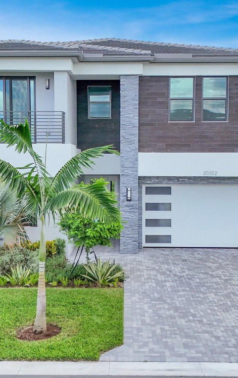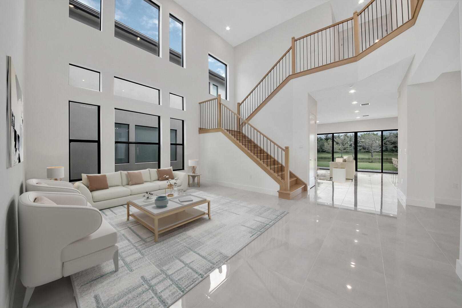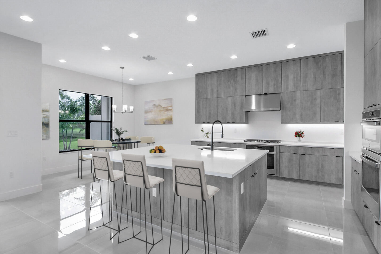 Welcome to this stunning Polynesia model in the sought-after community of Lotus Palm. The foyer leads to a formal living room with soaring two-story ceilings and an elegant formal dining area. The spacious family room flows seamlessly into an open chef's kitchen featuring quartz countertops, a center island with snack bar, stainless steel appliances, double ovens, a 5-burner gas range, and a sunny breakfast nook. The first floor also offers a cabana bath and a guest bedroom with an ensuite bath and walk-in closet. Upstairs, the luxurious primary suite impresses with a double-door entry, coffered ceiling, expansive walk-in closet, and his and hers bathrooms.