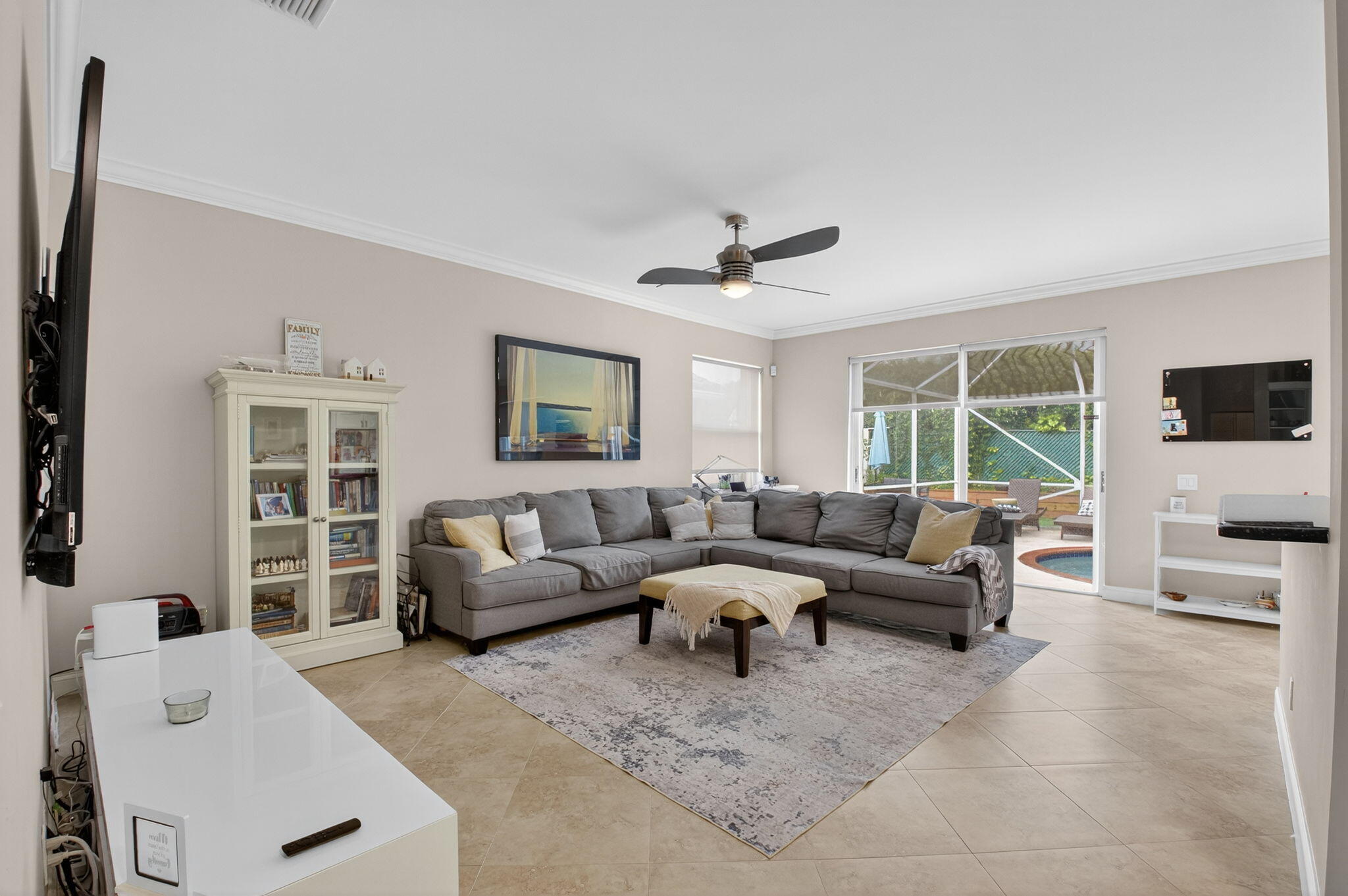 Beautiful 4-bedroom pool home in a gated community with low HOA fees and a brand new roof coming soon! Located near top-rated schools, this immaculate home features just installed new kitchen cabinets, granite countertops, stainless steel appliances, and a built-in pantry. Enjoy elegant 20'' porcelain tile floors, crown molding, and smooth ceilings throughout. The spacious master suite includes walk-in closets, while the upstairs features engineered wood floors and upgraded bedroom flooring. Relax in your screened-in pool surrounded by lush landscaping and a fenced yard. Additional highlights include accordion hurricane shutters, a paved driveway and walkway, and a stylish exterior--move-in readyA/C 2024, water heater 2021, kitchen cabinets 2025