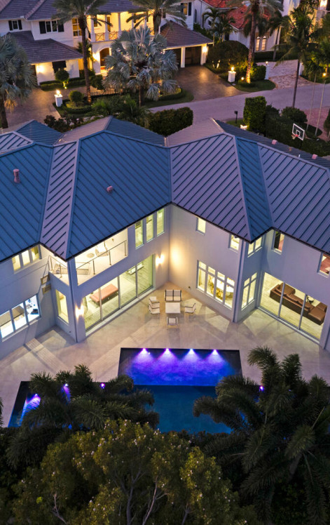 A contemporary, light-filled home on an oversized lot with 165 feet of golf course frontage in Royal Palm. The 7,911 SF residence (9,900 SF total) offers 6 en-suite bedrooms, 7 full baths, and 3 first-floor powder rooms. The chef's kitchen includes 4 Wolf ovens, Sub-Zero refrigeration, two islands, four dishwashers, and two sinks. A dramatic glass, steel, and Caesarstone staircase and custom closets elevate the interiors. Smart-home systems by Lutron and Savant, a 4-car AC garage with 2 EV chargers, and gated 15 ft Calophyllum landscaping ensure privacy and comfort. The 50 ft lap pool features a covered dining area with a Wolf grill, mini fridge, and storage. Recent upgrades include new ACs, full-house generator, new washers/dryers, and water filtration.