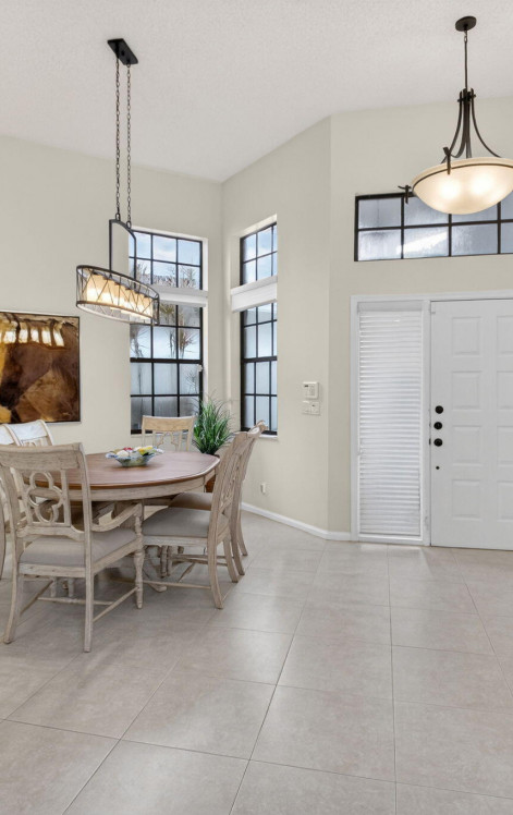 Discover effortless, resort-style living in this beautifully maintained single-story home located in the desirable Village of Oak Run within the prestigious Broken Sound Country Club. Offering over 2,100 sq ft of light-filled living space, this 3-bedroom, 2.5-bath residence blends comfort, style, and the best of South Florida living. Step inside to find sleek porcelain tile floors, volume ceilings, and impact windows and doors that enhance both elegance and peace of mind. The spacious primary suite features a large walk-in closet and a luxurious en-suite bath complete with a frameless walk-in shower and a separate soaking tub, your perfect private retreat. The kitchen is designed for both function and style, showcasing rich wood cabinetry, abundant storage, expansive counter space, and