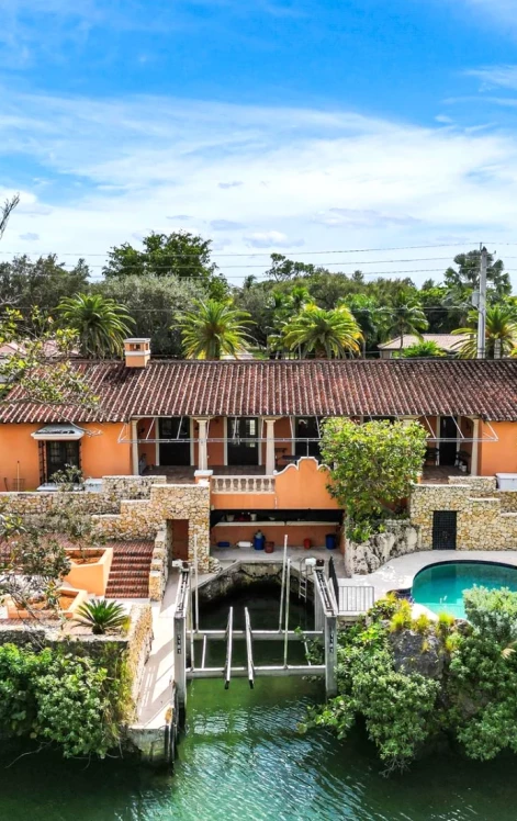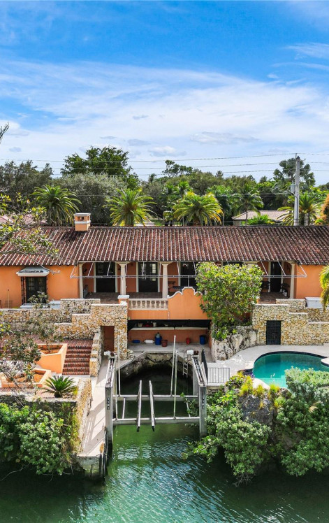 Waterfront Villa on the S. Gables Waterway.Boaters Dream or live on the water.Protected cove dock for the boat.First time on the market.Completely Walled and gated for privacy.Beautiful backyard overlooks the water,pool and picturesque gardens with pathways.Large covered terrace is great for outside entertainment overlooking the water.Built high up, the back yard has commanding views.All bedrooms have balconies that open to fresh air and views of the landscaping.Impact glass,Poggenpohl kitchen with Island and gas stove.Viking,Sub Zero and Miele appliances.Also wine cooler.Den,Very high cielings,fireplace,2 car garage. Newer AC-water heater.Walk to Sunset elementary school, bathrooms original.