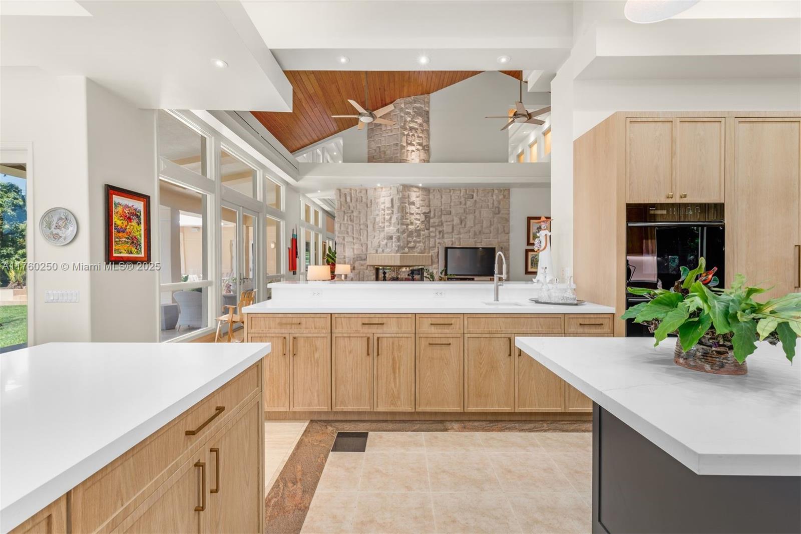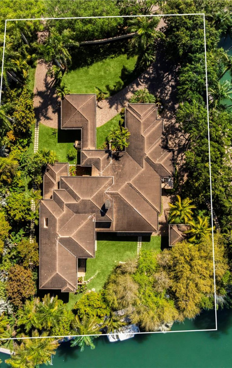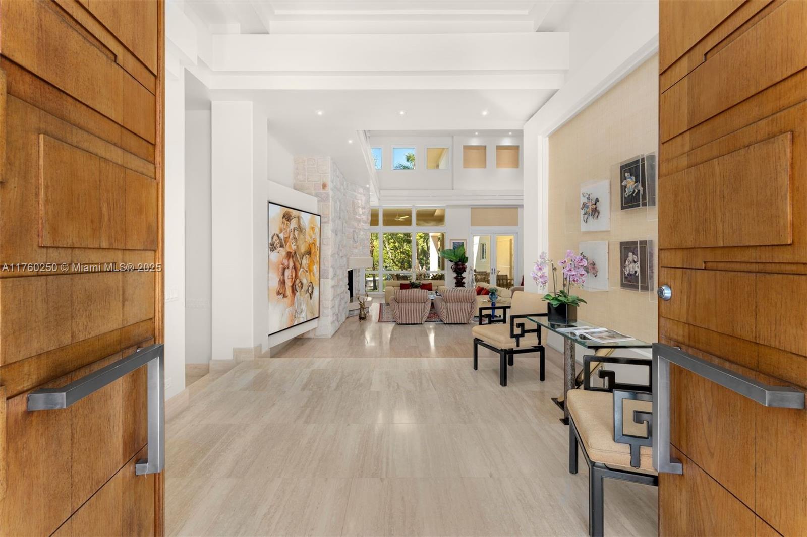 Designed by Barry Sugerman, this 7,698 SF waterfront estate in Gables Estates is a true masterpiece of elegance and modern luxury. Featuring 5 bedrooms, 7.5 bathrooms, the home showcases soaring wood-paneled ceilings, panoramic impact windows, and a grand stone fireplace. The custom open-concept kitchen boasts top-tier appliances, a marble island, and coffered ceilings. The principal suite has a private terrace with canal views, dual spa-like baths, and custom walk-in closets. Outdoors, enjoy stunning sunsets, over 400 ft. of water frontage, a private dock, 2 boat lifts, a shaded gazebo, covered terraces for alfresco dining, a cabana bath, lush landscaping and an included tennis membership. Complete with a home audio system, art lighting, and smart security, this is an architectural gem.