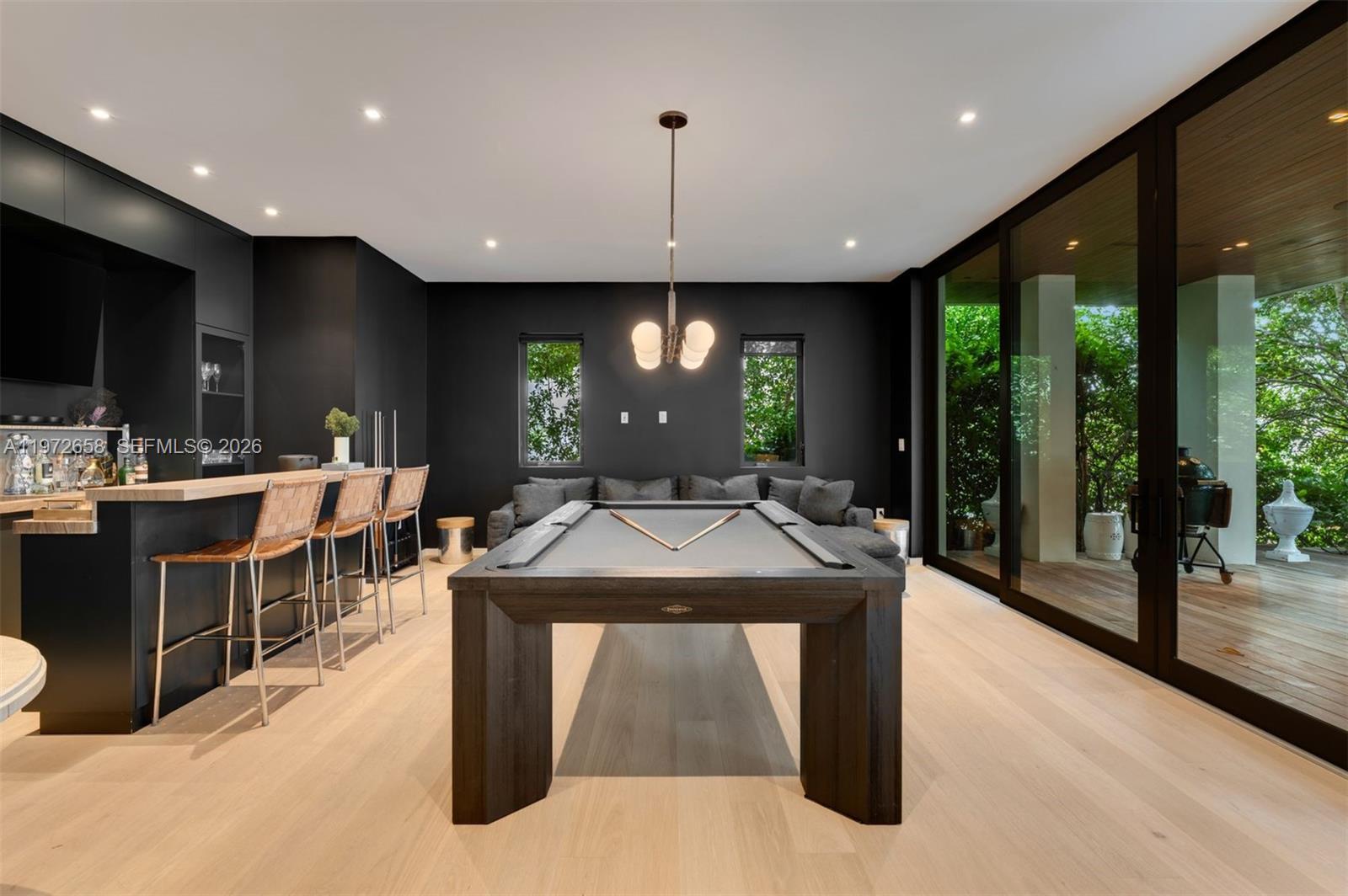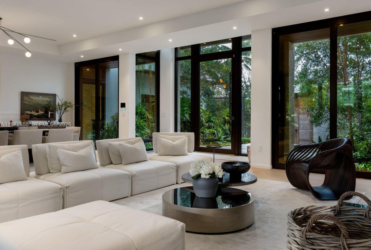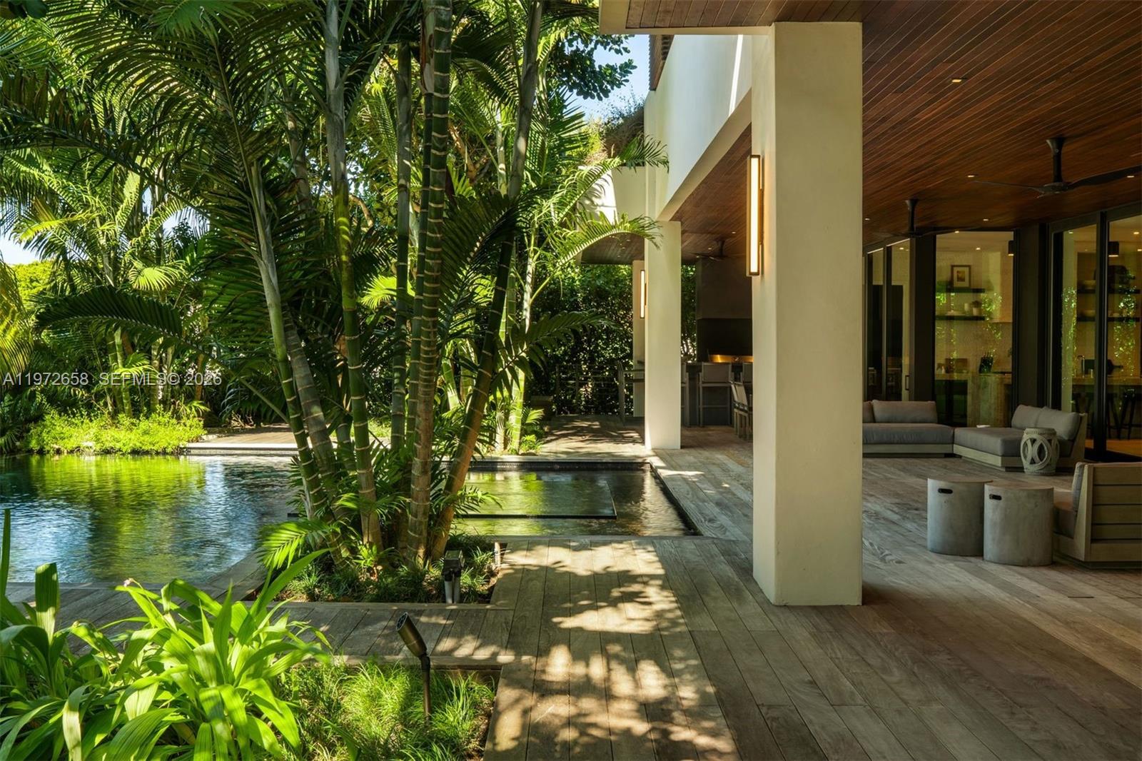 There are homes you enter & then there are homes that transport you. Behind the gates of Sunrise Harbour, a quiet lane leads you to Villa Aman, a private waterfront Balinese retreat discovered by chance. As you arrive, the world slows. Cascading koi ponds ripple gently beside a stone entry, framed by lush palms, exotic species, & layered foliage sway softly in the breeze, creating a curtain of serenity. Nearly 7200 SF unfolds in a graceful, light-filled flow. Rich textures, warm woods, sculptural stone, & walls of glass dissolve the boundary between indoors & out. Understated yet powerful, organic yet tailored, an epicurean kitchen is the heart of the home + a secondary space for pantry & preparation. Sunlight dances across textured surfaces by day, while evenings glow with an intimate warmth. Living spaces open effortlessly to deep & expansive waterfront terraces where evenings drift into sunset over the Gables Waterway. 6 suites + Den welcome your guests and family with the primary as the true showstopper. Below a full-scale lower-level basement, is an entire world unto itself. Out back, the property reveals its most coveted gift: deep, wide-open water frontage within Sunrise Harbour, one of the most prized yachting enclaves. Here, your vessel rests just moments from Biscayne Bay, with no bridges and unfettered ocean access, ready to take you anywhere. Villa Aman is where architecture, nature, & lifestyle come toegtehr. A true expression of tropical modern luxury.