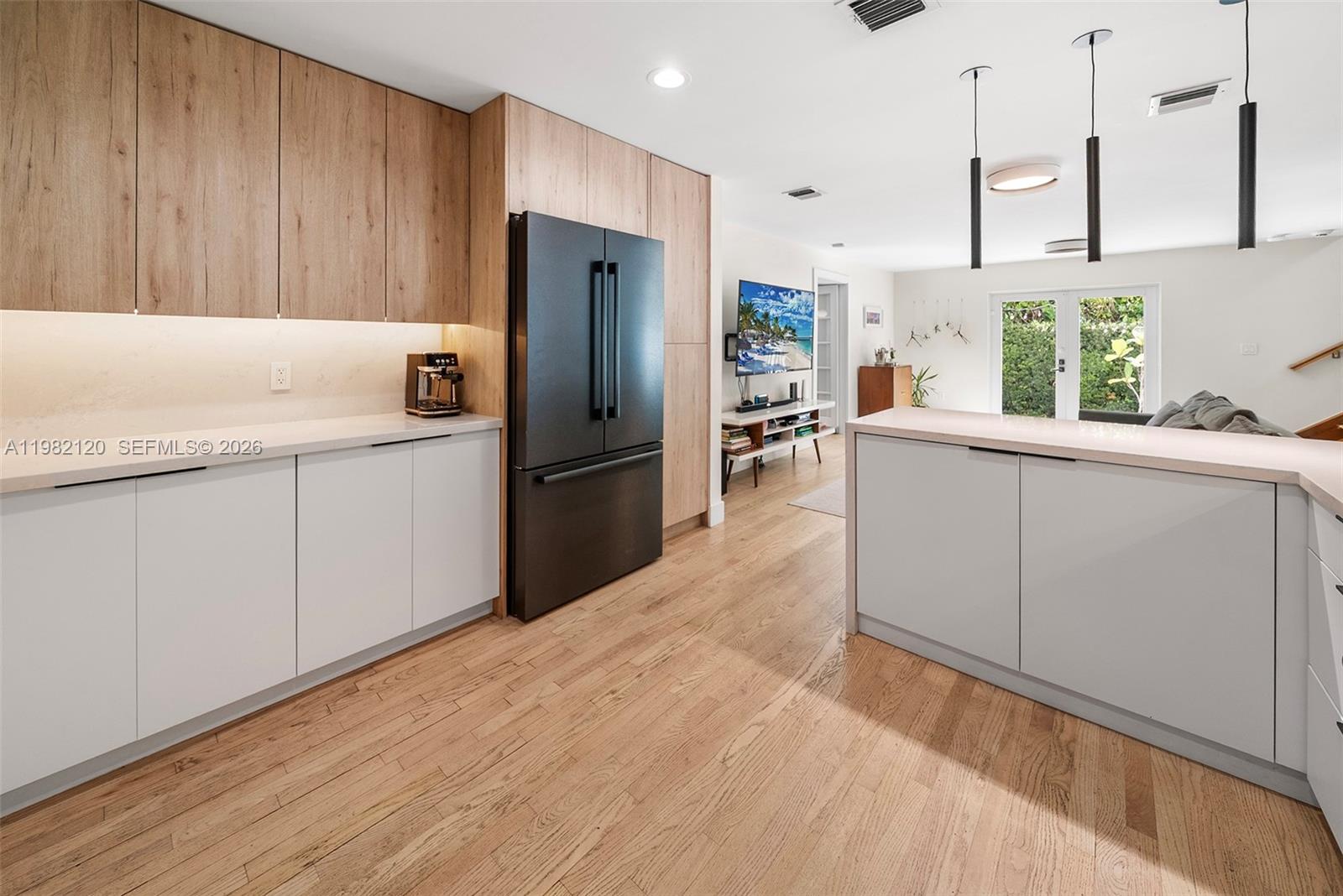 At the heart of the home, the kitchen and family room flow effortlessly together for everyday living. The kitchen features sleek Lioher cabinetry, Bosch appliances, and a cozy breakfast nook that overlooks the garden. French doors open to a tranquil terrace surrounded by lush greenery, an ideal setting for morning coffee & alfresco dinners.