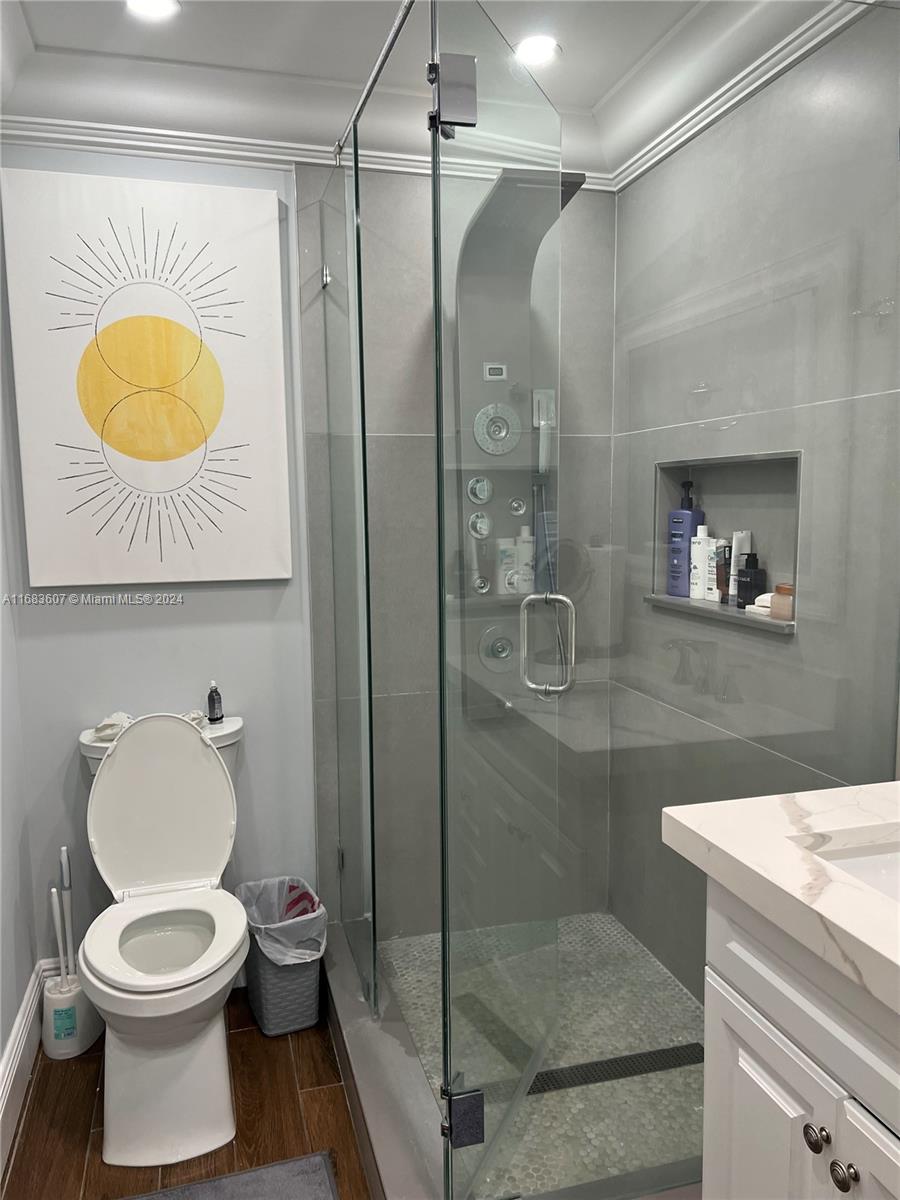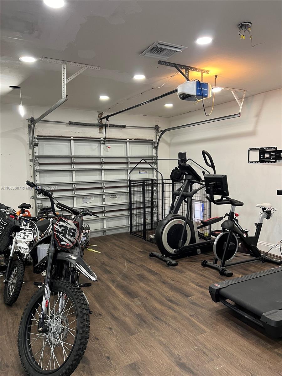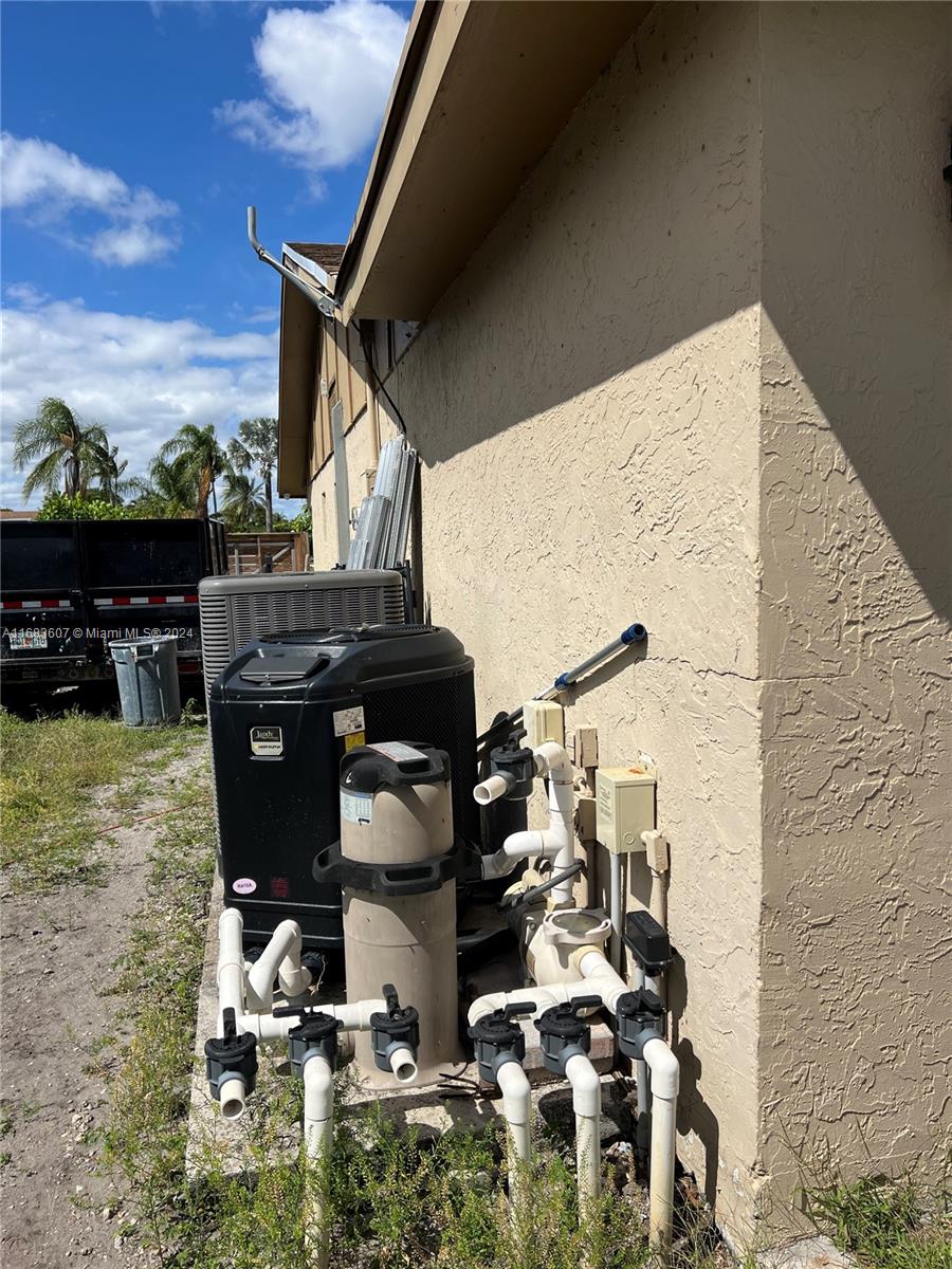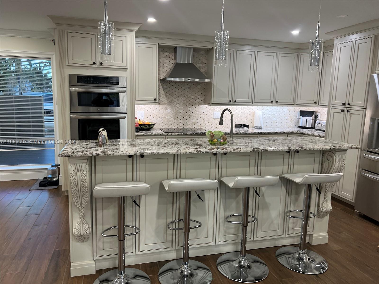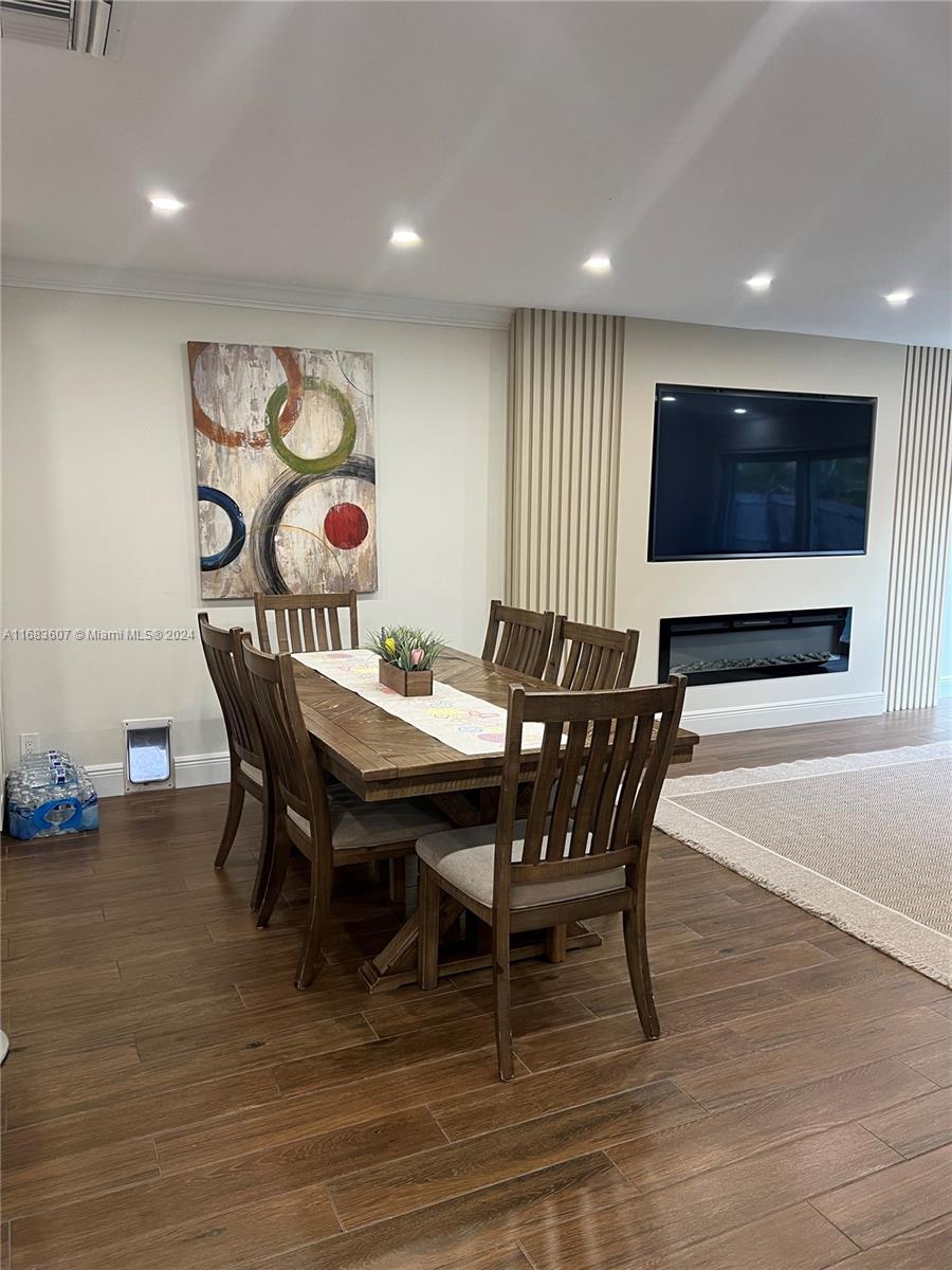 Very spacious 3 bedroom, 1 office and 2 bath pool home. Roof installed in 2020, AC and water heater in 2021, electrical including electrical panel was redone in 2019, all smooth ceiling , no popcorn ceiling here, new LED dimmable high hat lightning, coffered crown moulding in 3 bedrooms, wood plank porcelain tile throughout the house, baseboards, all interior solid doors, 12 feet impact sliding door, built-in wall unit with tv and electric fireplace, fully renovated kitchen with stainless steel appliances, granite countertops, travertine backsplash, wall oven and microwave combo, solid wood and soft closing cabinetry, garage is been used as a gym with mirrored wall, waterproof laminate flooring, extra pantry and cabinets.