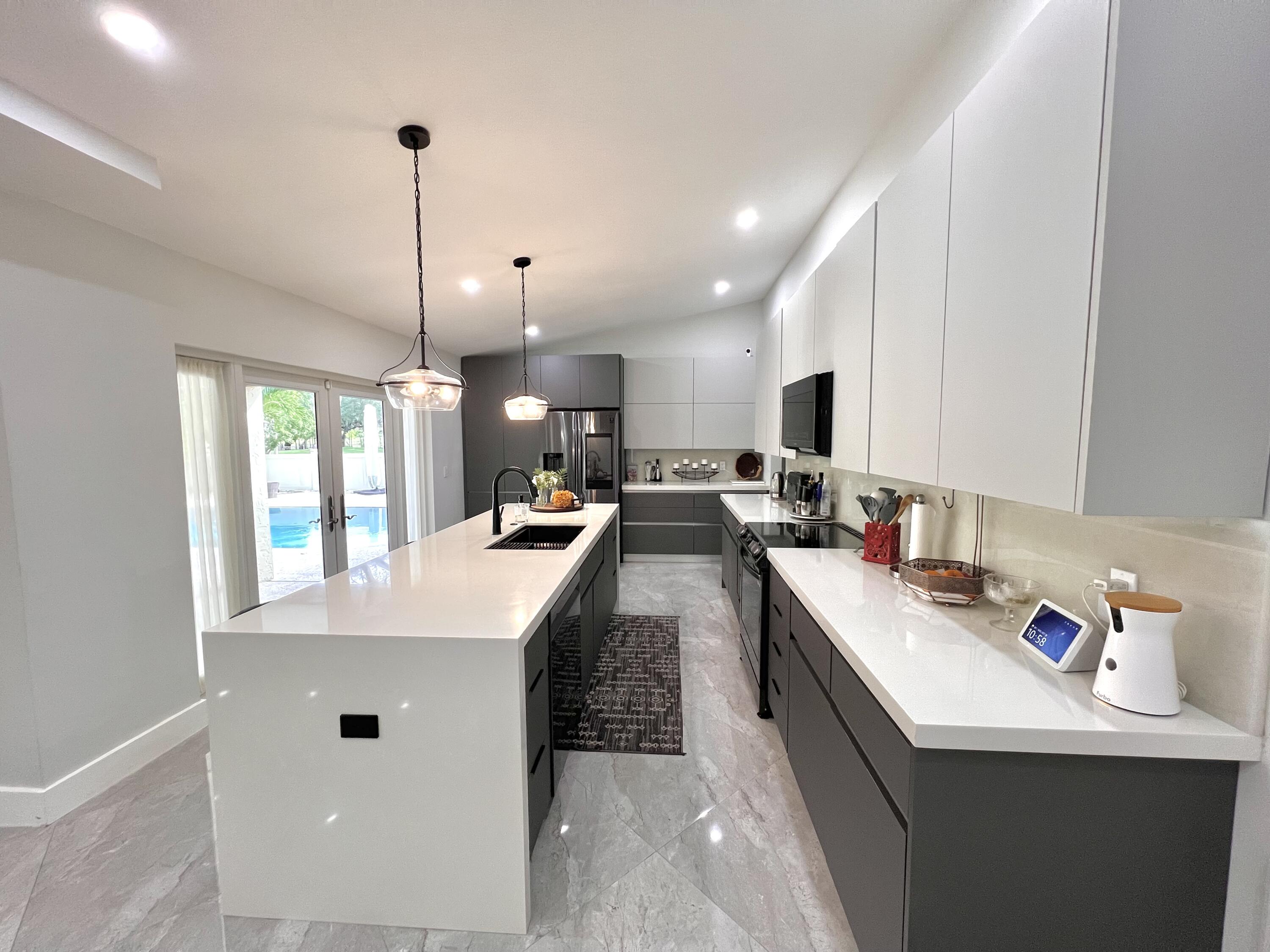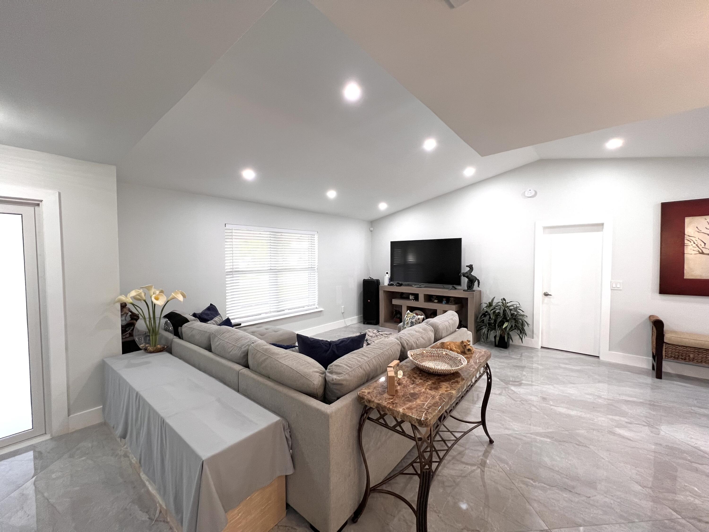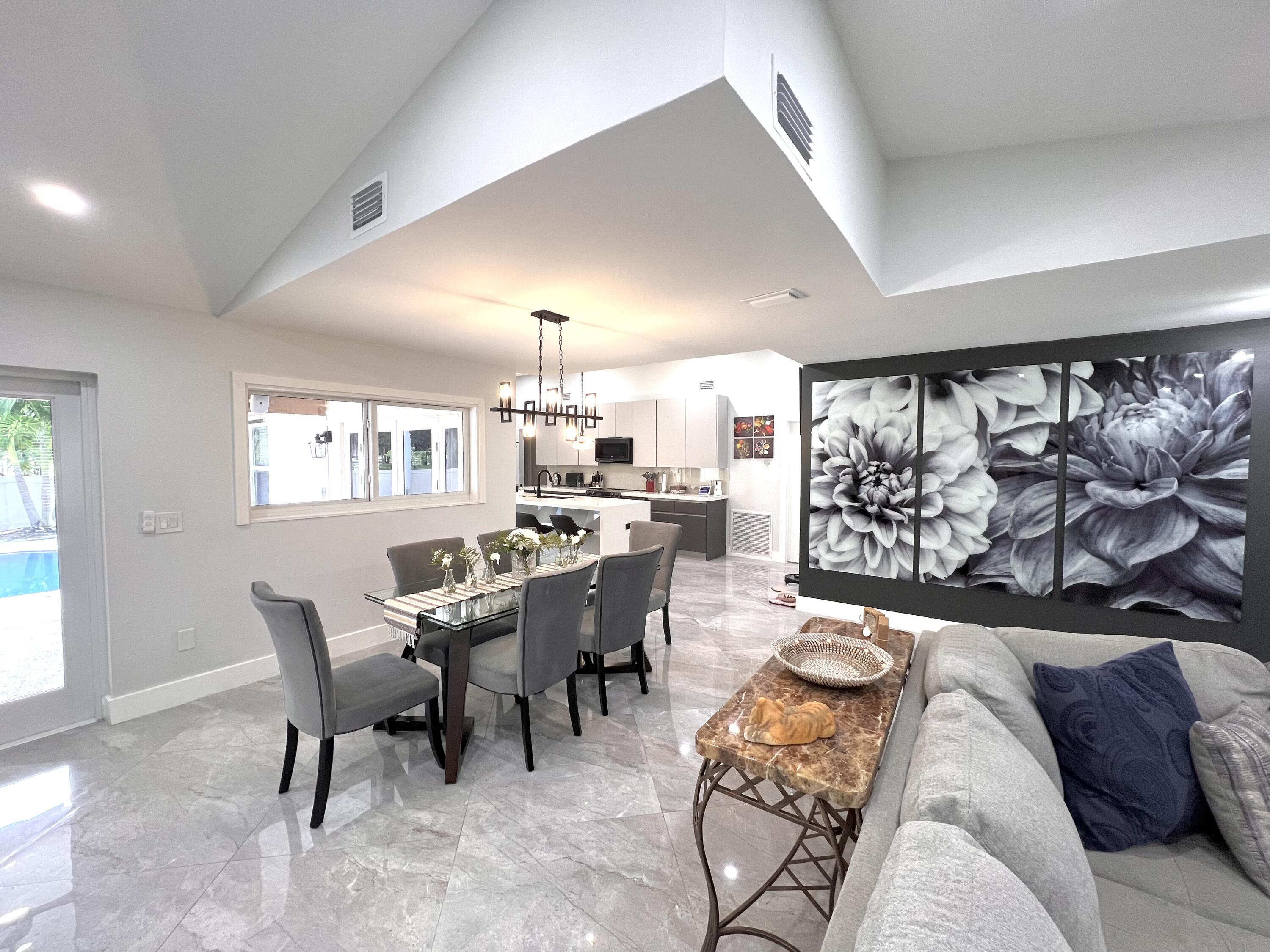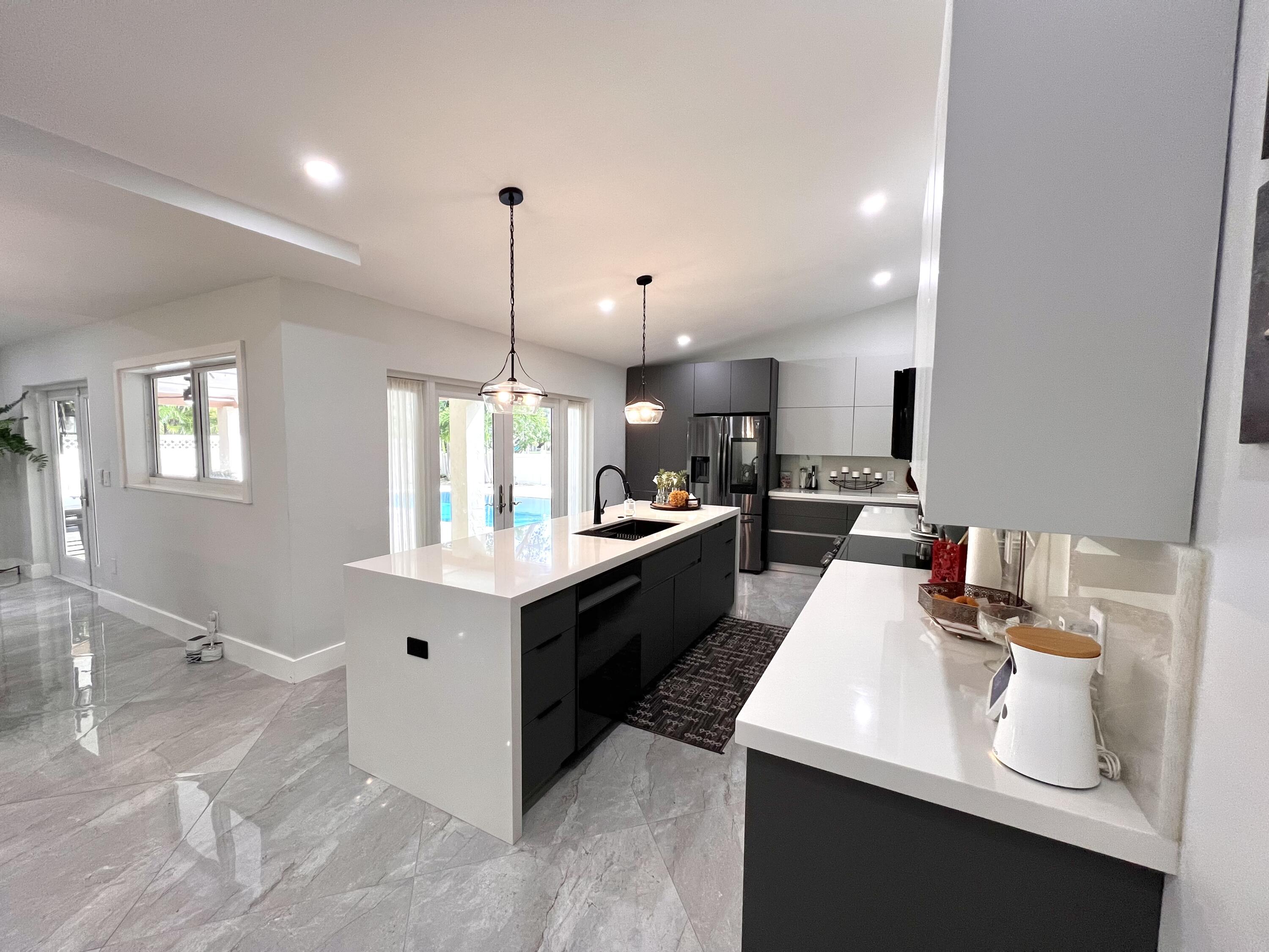 Welcome to your dream home! This beautifully renovated 4-bedroom, 2-bath house with spacious 2-car garage sits on a large corner lot, blending modern elegance with everyday comfort. Step inside to discover a bright, open-concept layout featuring vaulted ceilings, gorgeous tile flooring, and a stunning designer kitchen with a large island, perfect for family gatherings and entertaining guests. Step outside to your private backyard oasis, overlooking a peaceful park and complete with a heated saltwater pool, the ideal setting for relaxation and outdoor enjoyment. Enjoy peace of mind with major recent upgrades, including flat roof (2023), AC system (2023), electrical panel (2023), impact windows and doors, and a tankless water heater. Stylish and move-in ready, this home trully has it all!