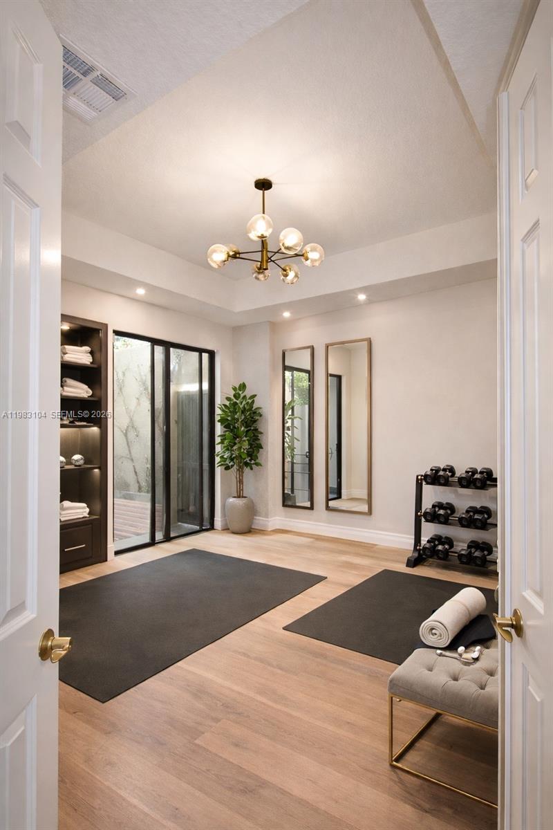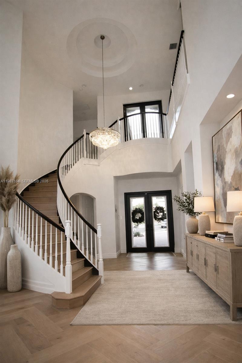 Dramatic two-story entry with double glass doors and a sweeping staircase creates a grand first impression. The home features beautiful wood flooring throughout, soaring ceilings, and expansive windows that fill the space with natural light. New window treatments and custom electric blinds add style and convenience.