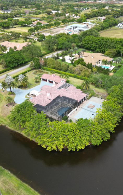Nestled within an ultra-exclusive gated enclave of just 52 homes in Tierra Del Rey Estates South, this extraordinary estate offers a rare blend of elegance, privacy, and resort-style living. Spanning 3.4 ACRES and surrounded by a tranquil LAKE on three sides, this breathtaking property is truly unique. Step inside to discover FIVE spacious bedrooms, complemented by a dedicated GYM, private OFFICE, children's playroom, and a state-of-the-art MOVIE THEATER--all designed to enhance both comfort and entertainment. The open-concept living spaces are bathed in natural light, offering seamless indoor-outdoor integration.The outdoor experience is nothing short of spectacular. A soaring 21-foot enclosed pool lanai features a summer kitchen, creating the ultimate space for