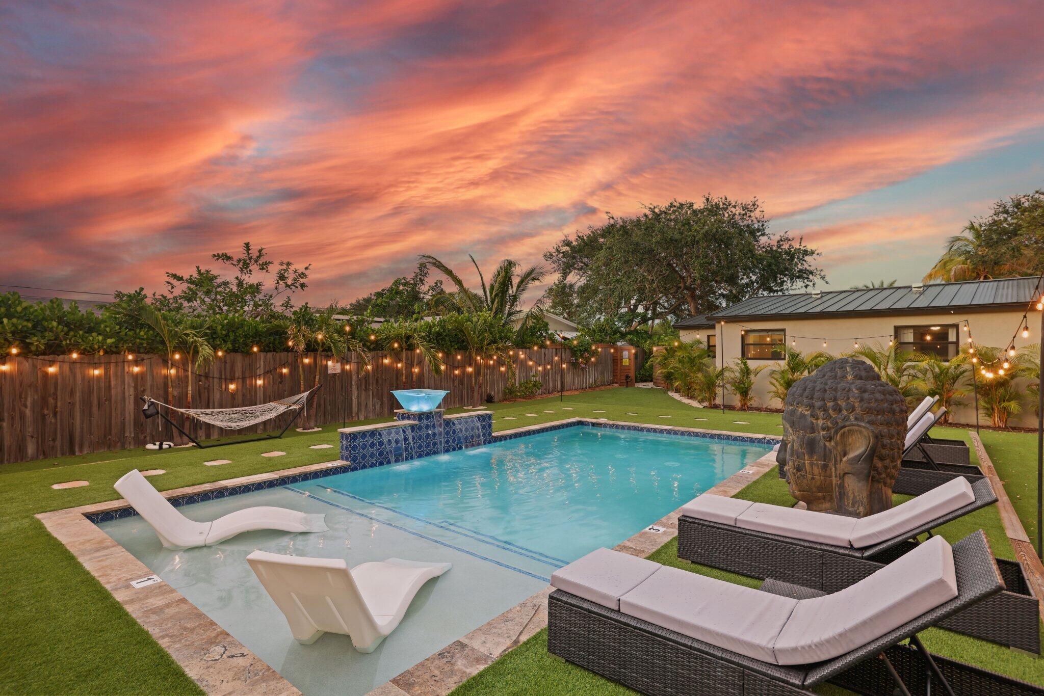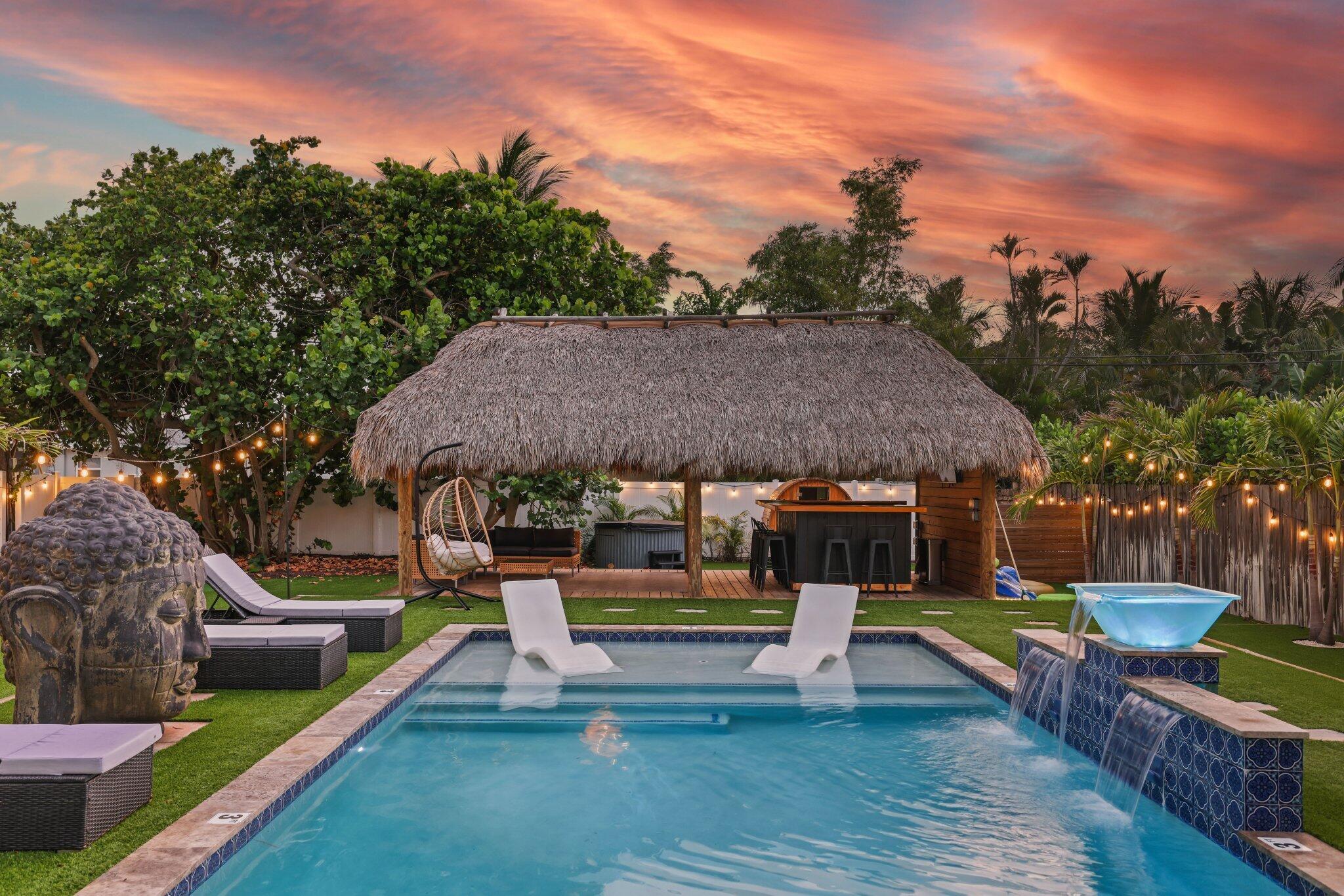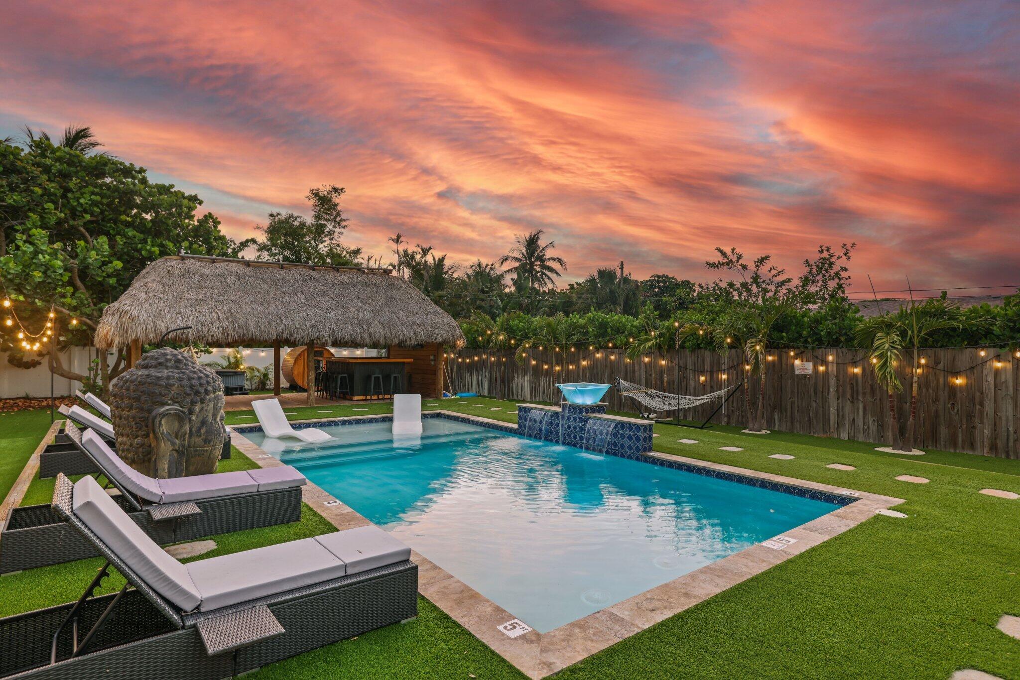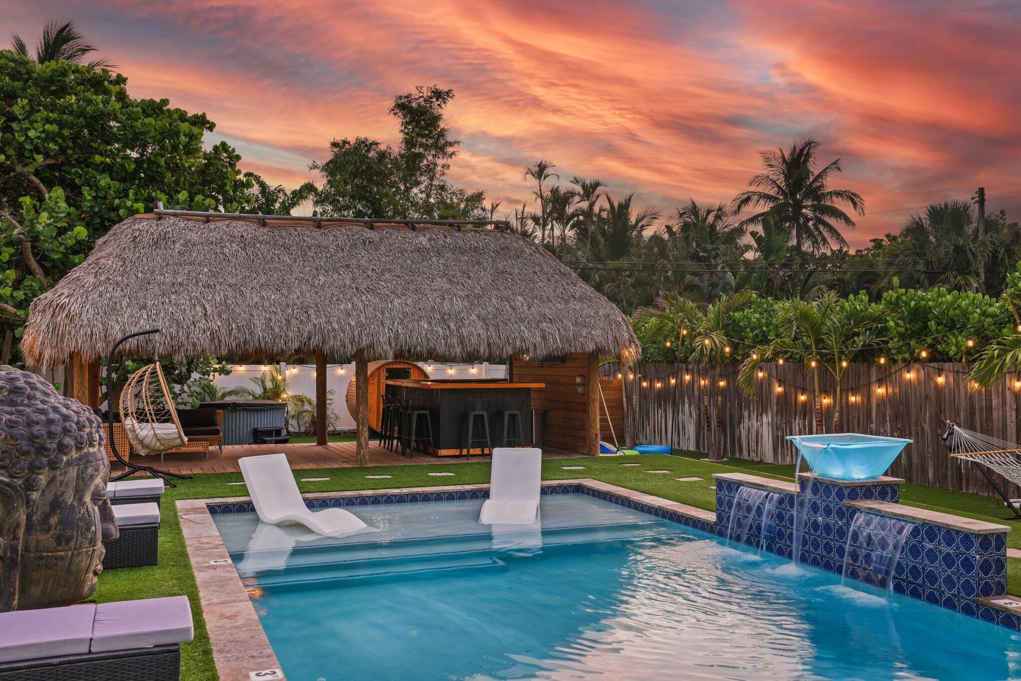 Introducing a rare opportunity to own a resort-style retreat in the heart of downtown Delray Beach. This stunning 3-bedroom home is perfectly positioned in one of South Florida's most vibrant and desirable neighborhoods. Set on a spacious 0.26-acre lot, the property offers both luxurious living and exceptional investment potential. Step into a tropical backyard oasis designed for relaxation and entertainment. Enjoy a sparkling pool, soothing hot tub, and private sauna--creating the ultimate outdoor escape. The lushly landscaped yard features a tiki hut with a built-in BBQ grill and ample outdoor seating, ideal for hosting gatherings or enjoying a quiet evening under the stars. Inside, the home utilizes a thoughtfully designed layout with a bright, functional kitchen,